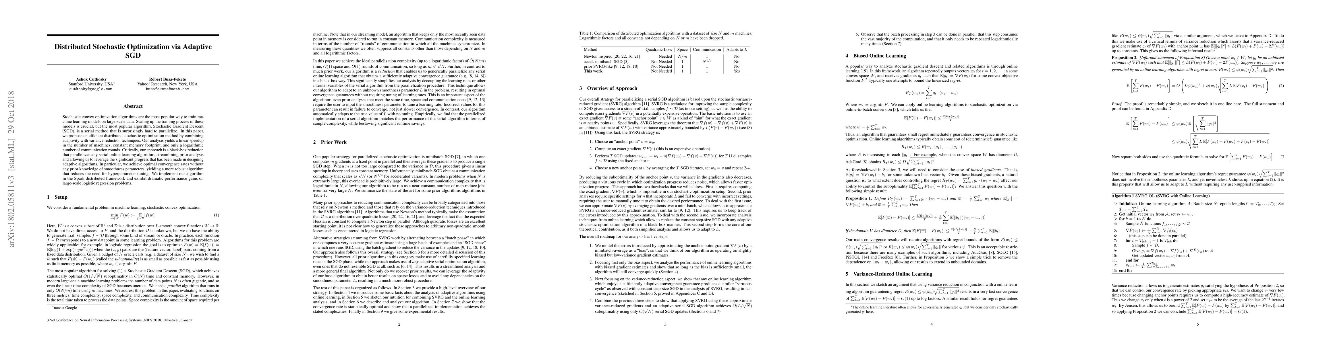 The paper proposes a distributed stochastic optimization method that combines adaptivity with variance reduction techniques, achieving linear speedup, constant memory footprint, and logarithmic communication rounds. It parallelizes any serial online learning algorithm as a black-box reduction, leveraging progress in adaptive algorithms without prior knowledge of smoothness parameters.