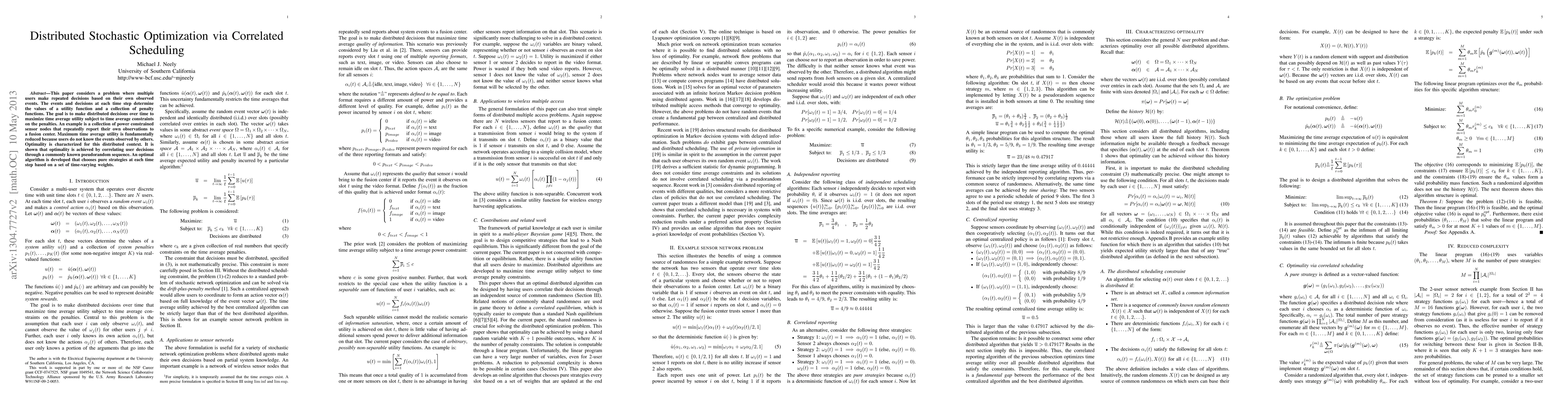 This paper considers a problem where multiple users make repeated decisions based on their own observed events. The events and decisions at each time step determine the values of a utility function and a collection of penalty functions. The goal is to make distributed decisions over time to maximize time average utility subject to time average constraints on the penalties. An example is a collection of power constrained sensor nodes that repeatedly report their own observations to a fusion center. Maximum time average utility is fundamentally reduced because users do not know the events observed by others. Optimality is characterized for this distributed context. It is shown that optimality is achieved by correlating user decisions through a commonly known pseudorandom sequence. An optimal algorithm is developed that chooses pure strategies at each time step based on a set of time-varying weights.