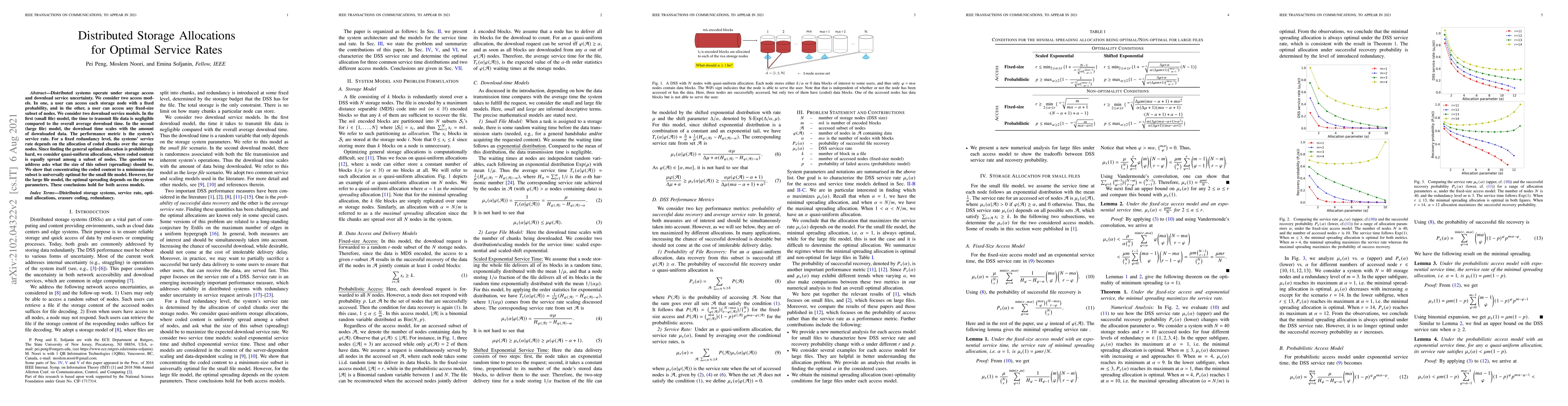 This paper explores optimal storage allocation strategies in distributed systems to maximize service rates under uncertainty in node access and download services. It finds that for small files, minimal subset allocation is optimal, while for large files, optimal spreading size depends on system parameters.
