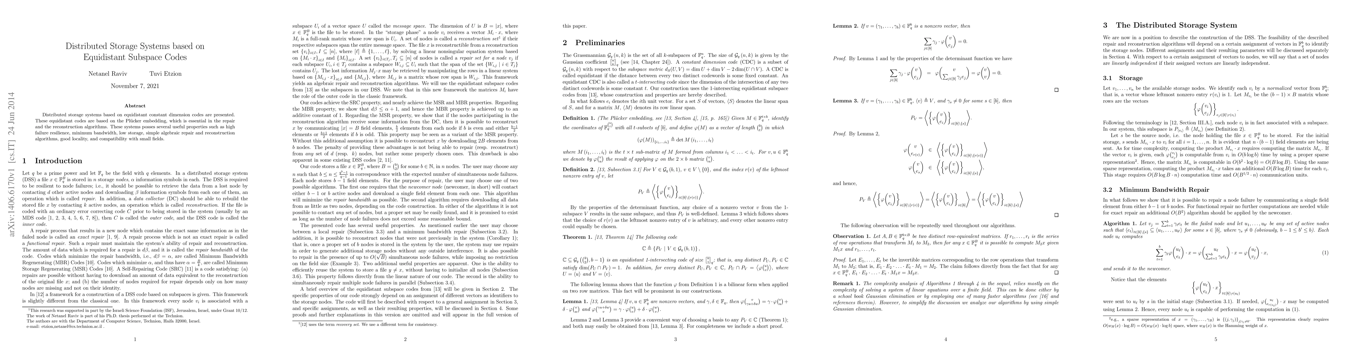 This paper introduces distributed storage systems utilizing equidistant constant dimension codes based on Plücker embedding, offering high resilience, minimal bandwidth, low storage, and efficient algebraic repair and reconstruction algorithms. These systems also maintain good locality and are compatible with small field operations.