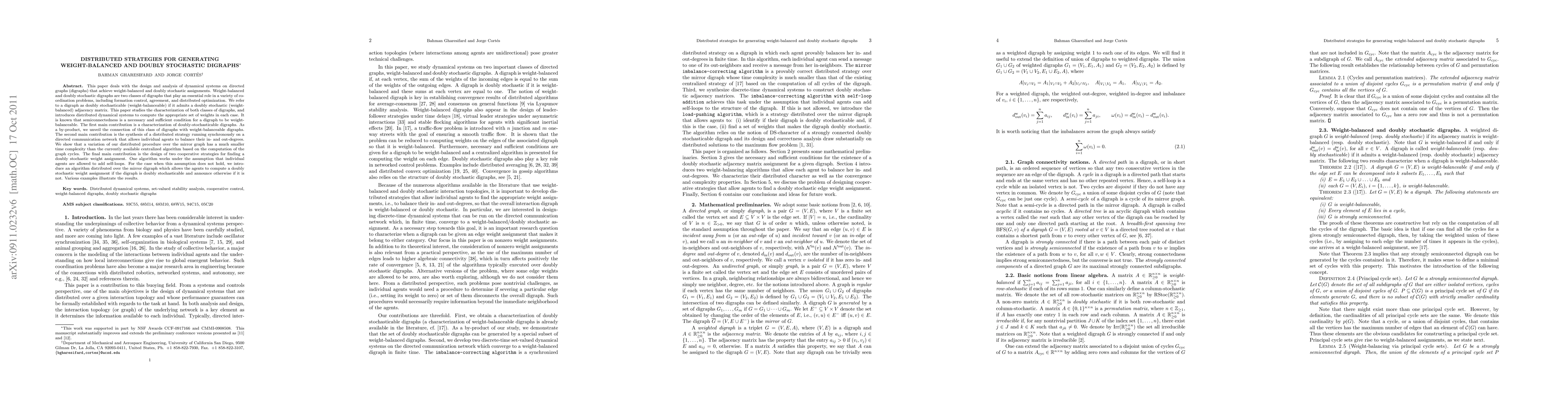 Weight-balanced and doubly stochastic digraphs are two classes of digraphs that play an essential role in a variety of cooperative control problems, including formation control, distributed averaging, and optimization. We refer to a digraph as doubly stochasticable (weight-balanceable) if it admits a doubly stochastic (weight-balanced) adjacency matrix. This paper studies the characterization of both classes of digraphs, and introduces distributed algorithms to compute the appropriate set of weights in each case.