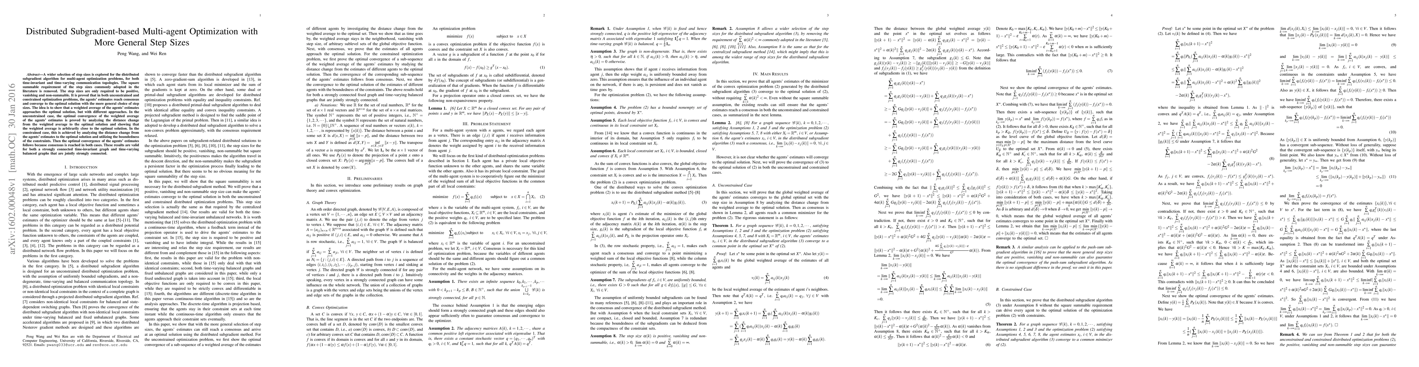 A wider selection of step sizes is explored for the distributed subgradient algorithm for multi-agent optimization problems, for both time-invariant and time-varying communication topologies. The square summable requirement of the step sizes commonly adopted in the literature is removed. The step sizes are only required to be positive, vanishing and non-summable. It is proved that in both unconstrained and constrained optimization problems, the agents' estimates reach consensus and converge to the optimal solution with the more general choice of step sizes. The idea is to show that a weighted average of the agents' estimates approaches the optimal solution, but with different approaches. In the unconstrained case, the optimal convergence of the weighted average of the agents' estimates is proved by analyzing the distance change from the weighted average to the optimal solution and showing that the weighted average is arbitrarily close to the optimal solution. In the constrained case, this is achieved by analyzing the distance change from the agents' estimates to the optimal solution and utilizing the boundedness of the constraints. Then the optimal convergence of the agents' estimates follows because consensus is reached in both cases. These results are valid for both a strongly connected time-invariant graph and time-varying balanced graphs that are jointly strongly connected.