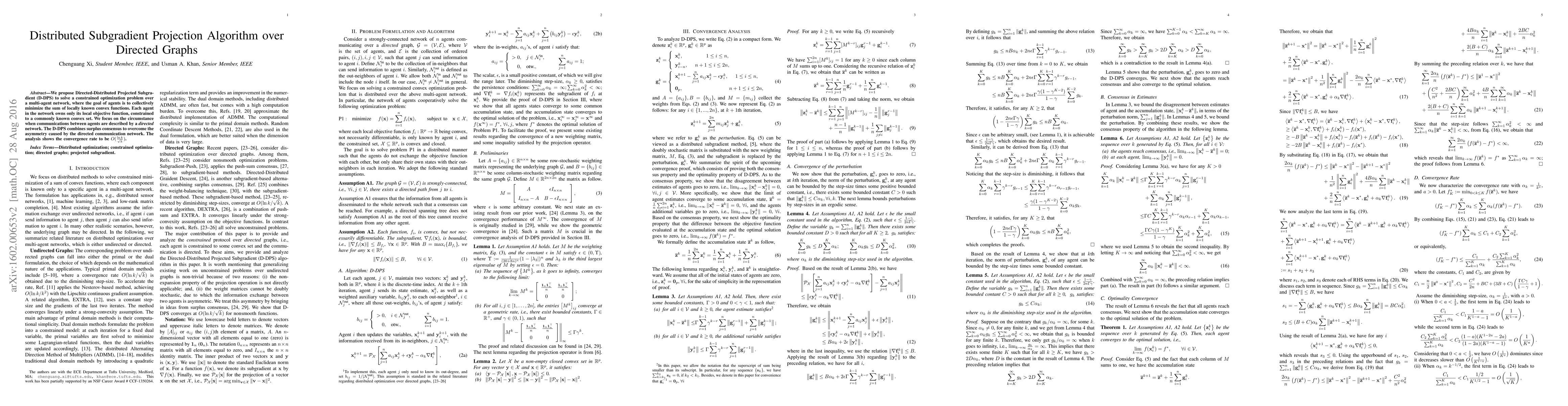 This paper introduces a distributed optimization algorithm, D-DPS, for multi-agent networks with directed communication. The algorithm addresses the asymmetry in directed graphs by adding an extra variable per agent, achieving convergence at a rate of $O(\frac{\ln k}{\sqrt{k}})$.