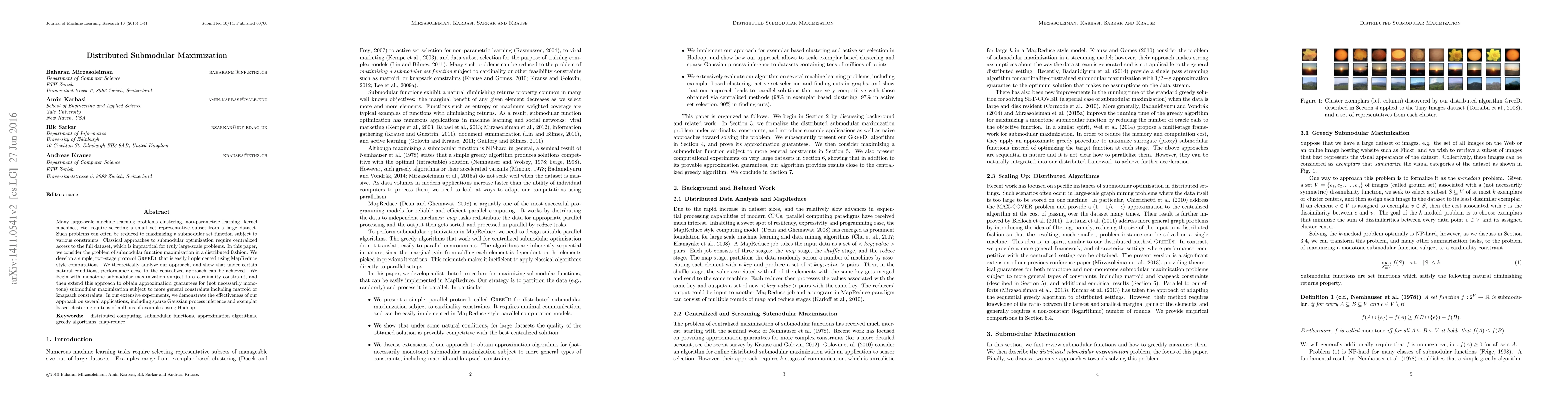 Many large-scale machine learning problems--clustering, non-parametric learning, kernel machines, etc.--require selecting a small yet representative subset from a large dataset. Such problems can often be reduced to maximizing a submodular set function subject to various constraints. Classical approaches to submodular optimization require centralized access to the full dataset, which is impractical for truly large-scale problems. In this paper, we consider the problem of submodular function maximization in a distributed fashion. We develop a simple, two-stage protocol GreeDi, that is easily implemented using MapReduce style computations. We theoretically analyze our approach, and show that under certain natural conditions, performance close to the centralized approach can be achieved. We begin with monotone submodular maximization subject to a cardinality constraint, and then extend this approach to obtain approximation guarantees for (not necessarily monotone) submodular maximization subject to more general constraints including matroid or knapsack constraints. In our extensive experiments, we demonstrate the effectiveness of our approach on several applications, including sparse Gaussian process inference and exemplar based clustering on tens of millions of examples using Hadoop.