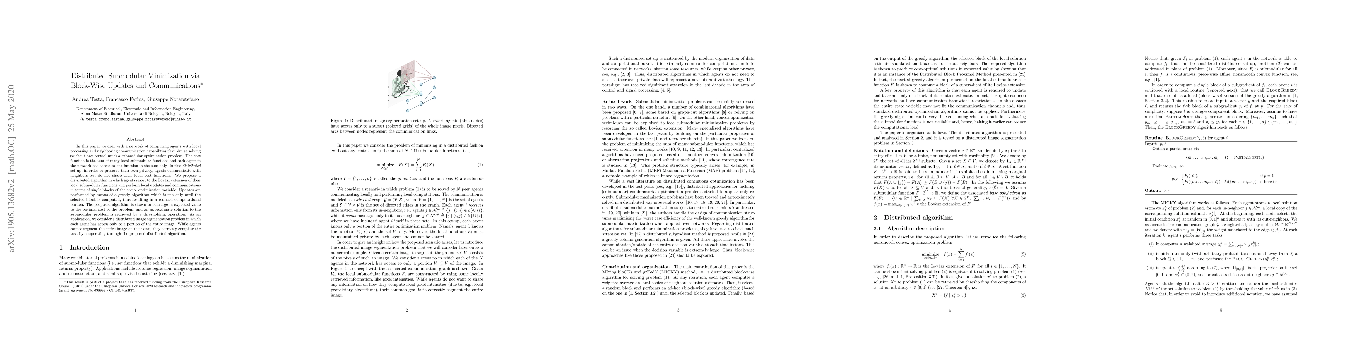 In this paper we deal with a network of computing agents with local processing and neighboring communication capabilities that aim at solving (without any central unit) a submodular optimization problem. The cost function is the sum of many local submodular functions and each agent in the network has access to one function in the sum only. In this \emph{distributed} set-up, in order to preserve their own privacy, agents communicate with neighbors but do not share their local cost functions. We propose a distributed algorithm in which agents resort to the Lov\`{a}sz extension of their local submodular functions and perform local updates and communications in terms of single blocks of the entire optimization variable. Updates are performed by means of a greedy algorithm which is run only until the selected block is computed, thus resulting in a reduced computational burden. The proposed algorithm is shown to converge in expected value to the optimal cost of the problem, and an approximate solution to the submodular problem is retrieved by a thresholding operation. As an application, we consider a distributed image segmentation problem in which each agent has access only to a portion of the entire image. While agents cannot segment the entire image on their own, they correctly complete the task by cooperating through the proposed distributed algorithm.