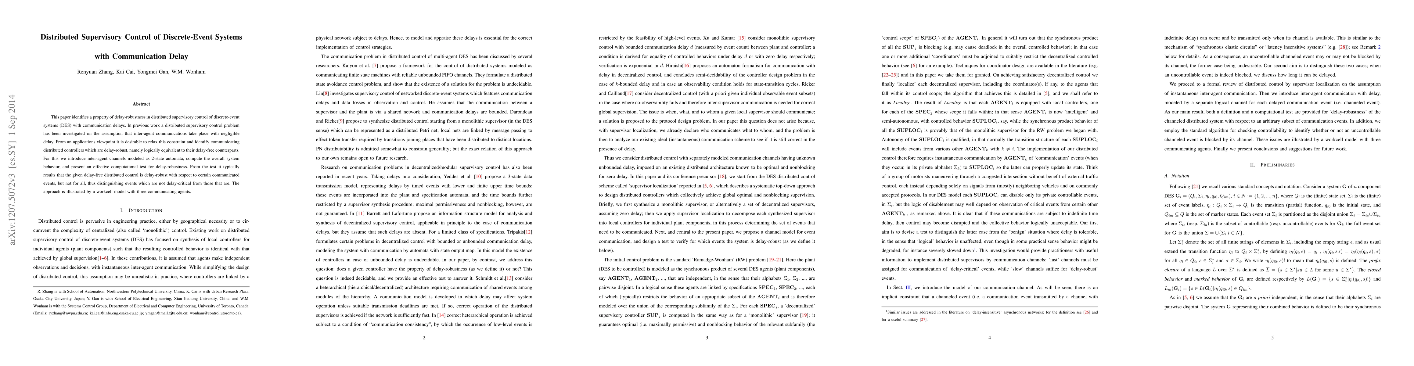 This paper proposes a method for distributed supervisory control of discrete-event systems that accounts for communication delays, introducing delay-robustness tests to determine if distributed controllers remain functionally equivalent under delays. The approach distinguishes delay-critical from non-critical events through a computational test, illustrated with a workcell model.
