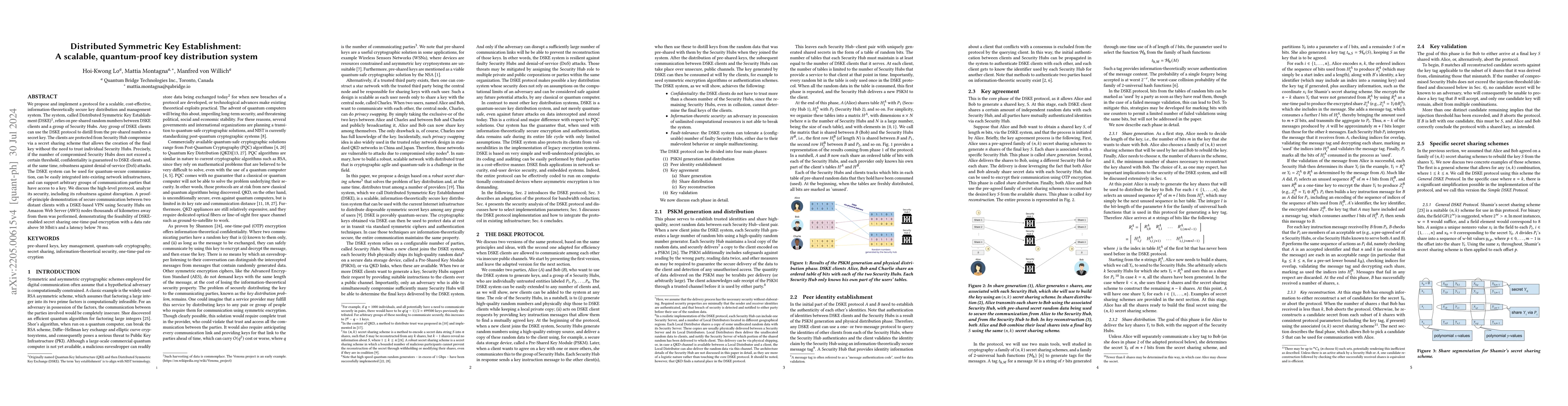 We propose and implement a protocol for a scalable, cost-effective, information-theoretically secure key distribution and management system. The system, called Distributed Symmetric Key Exchange (DSKE), relies on pre-shared random numbers between DSKE clients and a group of Security Hubs. Any group of DSKE clients can use the DSKE protocol to distill from the pre-shared numbers a secret key. The clients are protected from Security Hub compromise via a secret sharing scheme that allows the creation of the final key without the need to trust individual Security Hubs. Precisely, if the number of compromised Security Hubs does not exceed a certain threshold, confidentiality is guaranteed to DSKE clients and, at the same time, robustness against denial-of-service (DoS) attacks. The DSKE system can be used for quantum-secure communication, can be easily integrated into existing network infrastructures, and can support arbitrary groups of communication parties that have access to a key. We discuss the high-level protocol, analyze its security, including its robustness against disruption. A proof-ofprinciple demonstration of secure communication between two distant clients with a DSKE-based VPN using Security Hubs on Amazon Web Server (AWS) nodes thousands of kilometres away from them was performed, demonstrating the feasibility of DSKEenabled secret sharing one-time-pad encryption with a data rate above 50 Mbit/s and a latency below 70 ms.