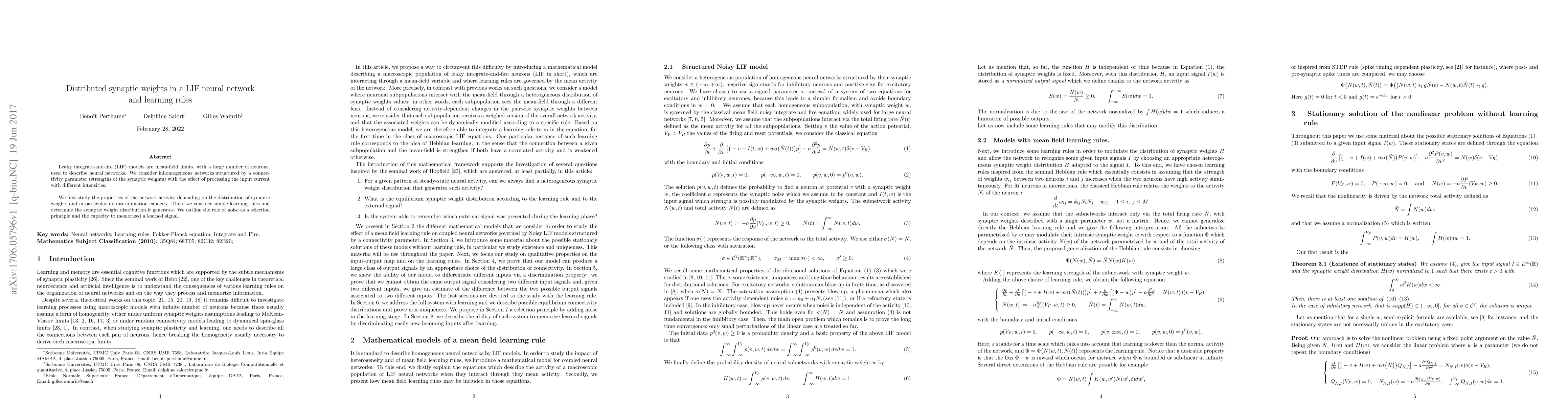 Leaky integrate-and-fire (LIF) models are mean-field limits, with a large number of neurons, used to describe neural networks. We consider inhomogeneous networks structured by a connec-tivity parameter (strengths of the synaptic weights) with the effect of processing the input current with different intensities. We first study the properties of the network activity depending on the distribution of synaptic weights and in particular its discrimination capacity. Then, we consider simple learning rules and determine the synaptic weight distribution it generates. We outline the role of noise as a selection principle and the capacity to memorized a learned signal.