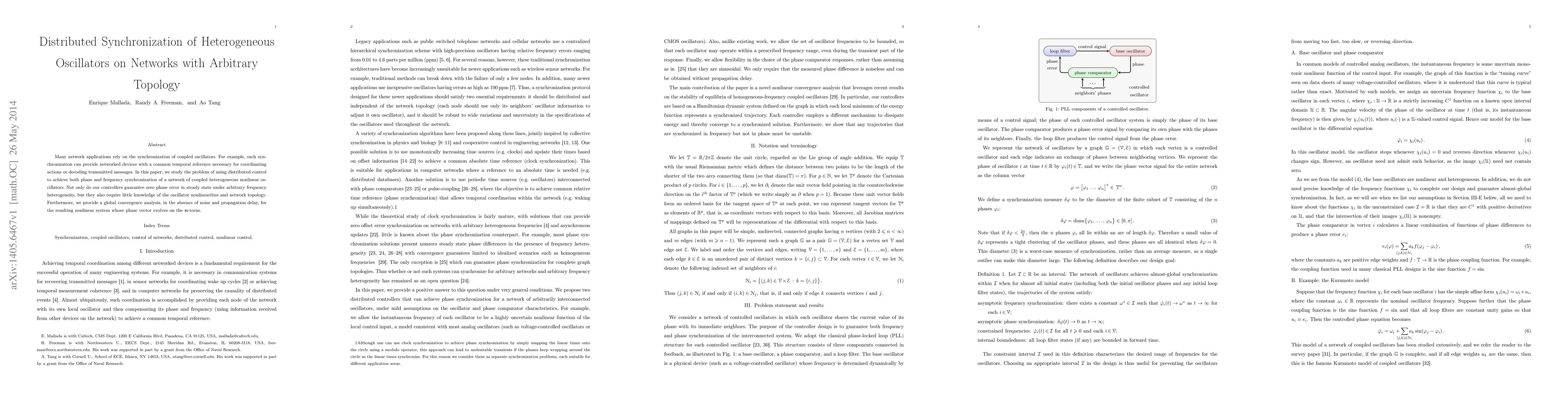 Many network applications rely on the synchronization of coupled oscillators. For example, such synchronization can provide networked devices with a common temporal reference necessary for coordinating actions or decoding transmitted messages. In this paper, we study the problem of using distributed control to achieve both phase and frequency synchronization of a network of coupled heterogeneous nonlinear oscillators. Not only do our controllers guarantee zero phase error in steady state under arbitrary frequency heterogeneity, but they also require little knowledge of the oscillator nonlinearities and network topology. Furthermore, we provide a global convergence analysis, in the absence of noise and propagation delay, for the resulting nonlinear system whose phase vector evolves on the n-torus.