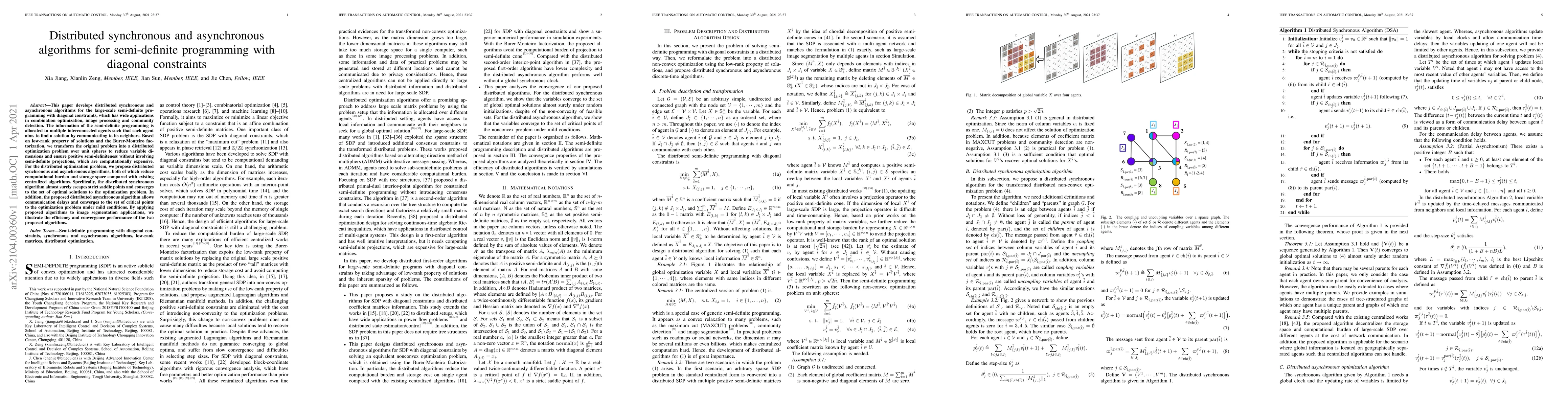 This paper develops distributed synchronous and asynchronous algorithms for the large-scale semi-definite programming with diagonal constraints, which has wide applications in combination optimization, image processing and community detection. The information of the semi-definite programming is allocated to multiple interconnected agents such that each agent aims to find a solution by communicating to its neighbors. Based on low-rank property of solutions and the Burer-Monteiro factorization, we transform the original problem into a distributed optimization problem over unit spheres to reduce variable dimensions and ensure positive semi-definiteness without involving semi-definite projections, which are computationally expensive. For the distributed optimization problem, we propose distributed synchronous and asynchronous algorithms, both of which reduce computational burden and storage space compared with existing centralized algorithms. Specifically, the distributed synchronous algorithm almost surely escapes strict saddle points and converges to the set of optimal solutions to the optimization problem. In addition, the proposed distributed asynchronous algorithm allows communication delays and converges to the set of critical points to the optimization problem under mild conditions. By applying proposed algorithms to image segmentation applications, we illustrate the efficiency and convergence performance of the two proposed algorithms.