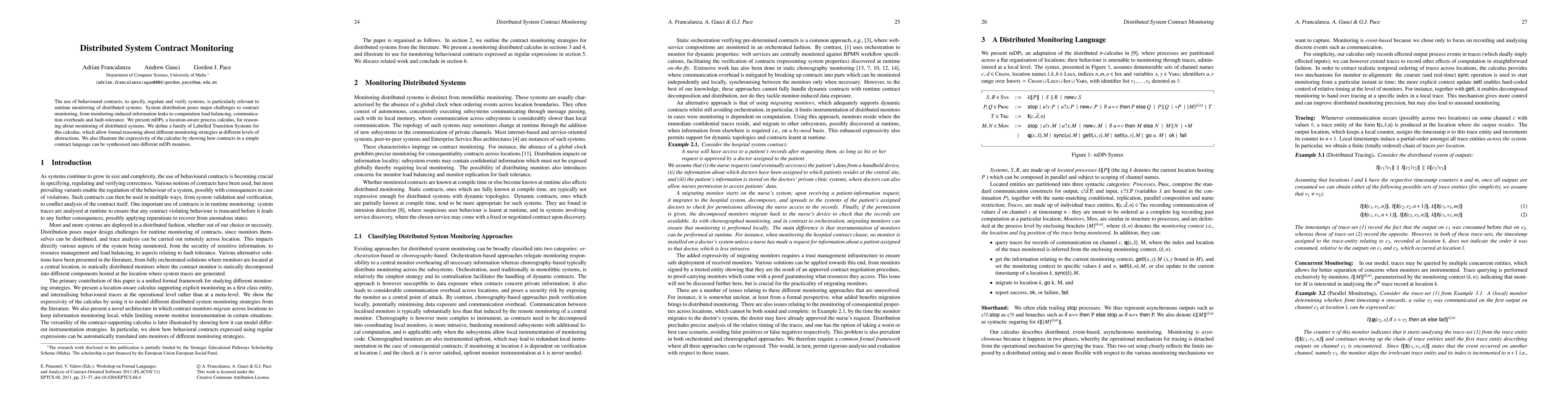 The use of behavioural contracts, to specify, regulate and verify systems, is particularly relevant to runtime monitoring of distributed systems. System distribution poses major challenges to contract monitoring, from monitoring-induced information leaks to computation load balancing, communication overheads and fault-tolerance. We present mDPi, a location-aware process calculus, for reasoning about monitoring of distributed systems. We define a family of Labelled Transition Systems for this calculus, which allow formal reasoning about different monitoring strategies at different levels of abstractions. We also illustrate the expressivity of the calculus by showing how contracts in a simple contract language can be synthesised into different mDPi monitors.