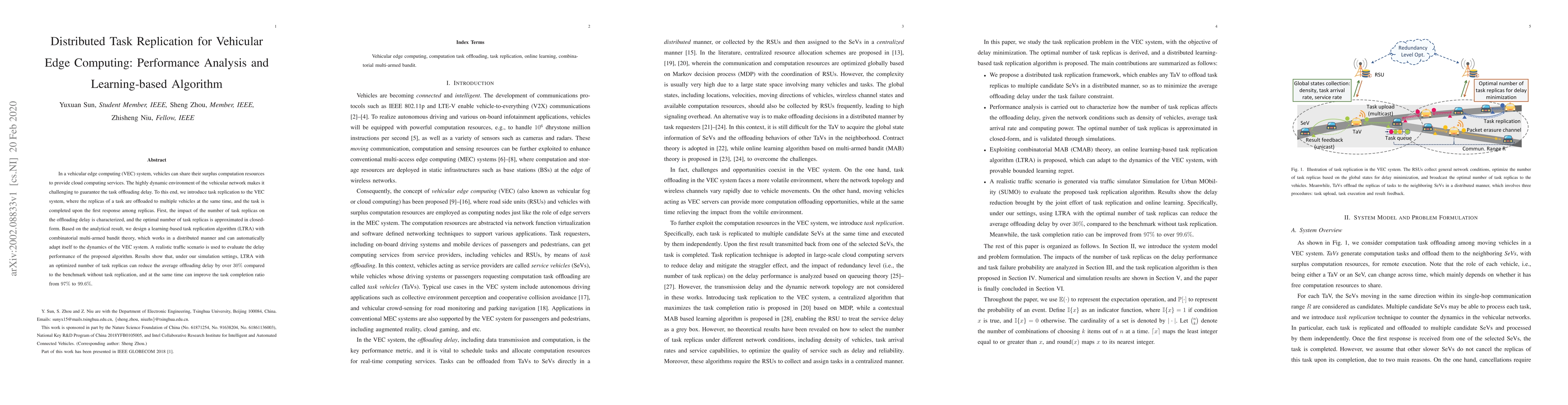 This paper proposes a distributed task replication method for vehicular edge computing to reduce offloading delay. It introduces a learning-based algorithm (LTRA) that optimizes the number of task replicas to minimize delay and improve task completion ratio, achieving over 30% reduction in delay and a completion ratio increase to 99.6%.