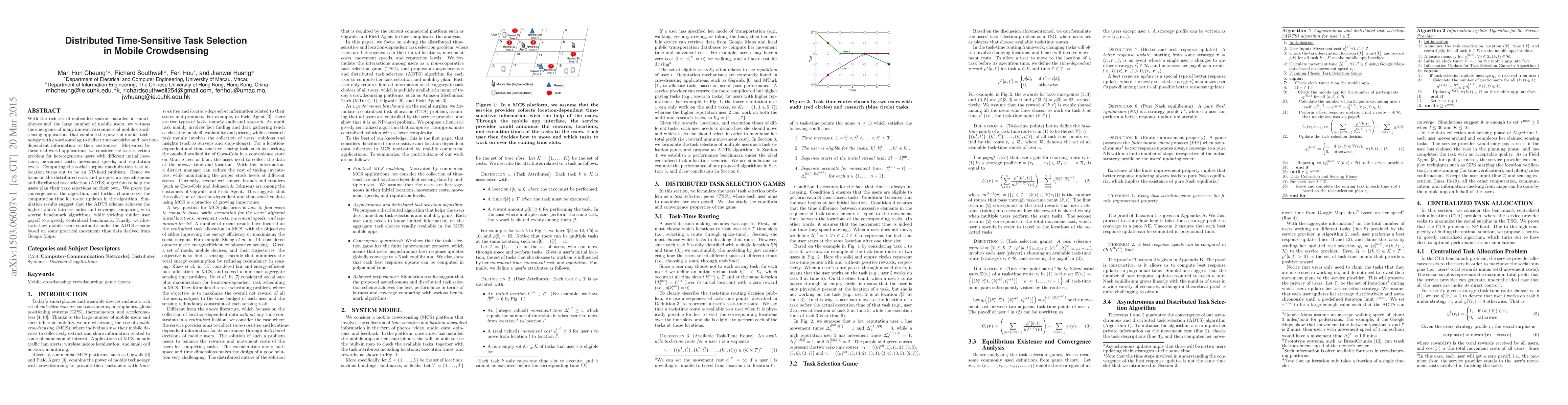 With the rich set of embedded sensors installed in smartphones and the large number of mobile users, we witness the emergence of many innovative commercial mobile crowdsensing applications that combine the power of mobile technology with crowdsourcing to deliver time-sensitive and location-dependent information to their customers. Motivated by these real-world applications, we consider the task selection problem for heterogeneous users with different initial locations, movement costs, movement speeds, and reputation levels. Computing the social surplus maximization task allocation turns out to be an NP-hard problem. Hence we focus on the distributed case, and propose an asynchronous and distributed task selection (ADTS) algorithm to help the users plan their task selections on their own. We prove the convergence of the algorithm, and further characterize the computation time for users' updates in the algorithm. Simulation results suggest that the ADTS scheme achieves the highest Jain's fairness index and coverage comparing with several benchmark algorithms, while yielding similar user payoff to a greedy centralized benchmark. Finally, we illustrate how mobile users coordinate under the ADTS scheme based on some practical movement time data derived from Google Maps.