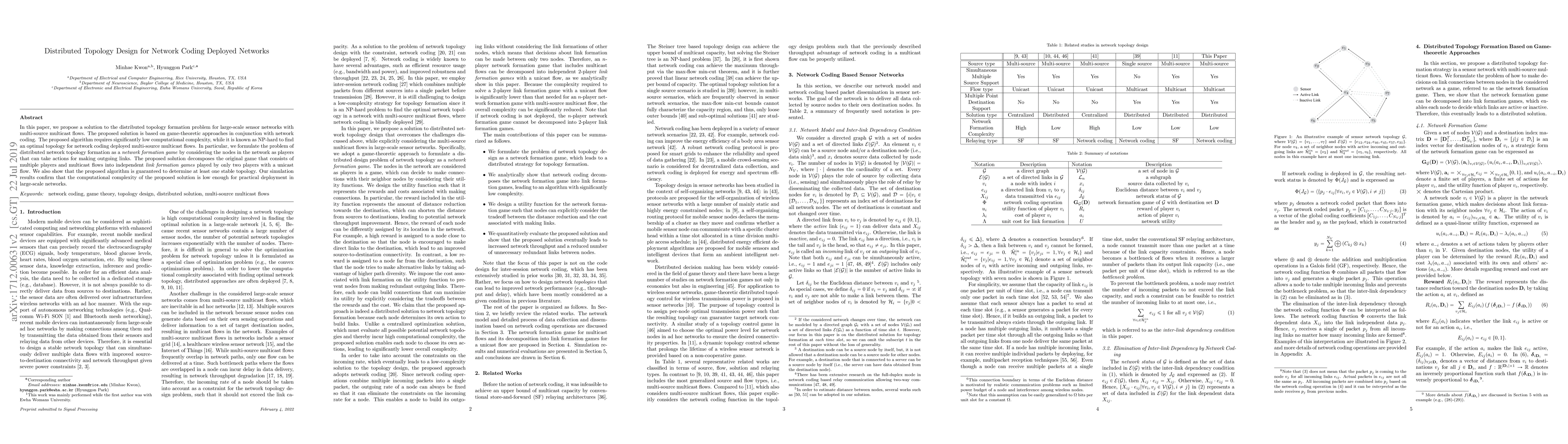 This paper proposes a game-theoretic algorithm for forming distributed topologies in large-scale sensor networks with multi-source multicast flows, leveraging network coding to achieve low computational complexity. The algorithm decomposes the NP-hard problem into simpler link formation games, ensuring at least one stable topology and demonstrating practical feasibility through simulations.