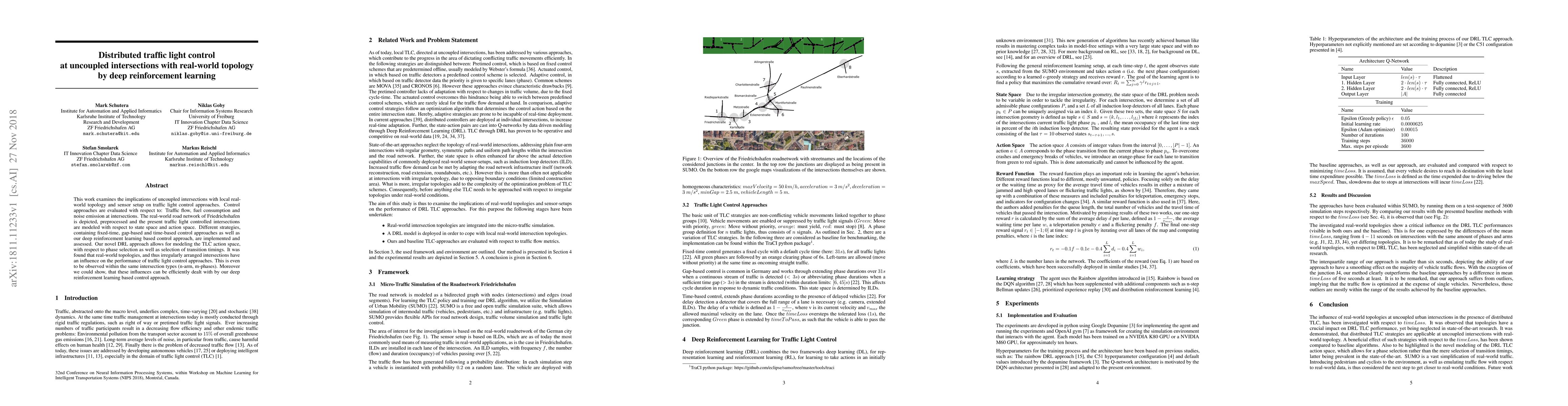 This paper explores distributed traffic light control at uncoupled intersections using deep reinforcement learning, demonstrating its effectiveness in managing real-world traffic flow, fuel consumption, and noise emissions. The study finds that deep reinforcement learning outperforms traditional control methods, especially in adapting to the unique topologies of irregularly arranged intersections.