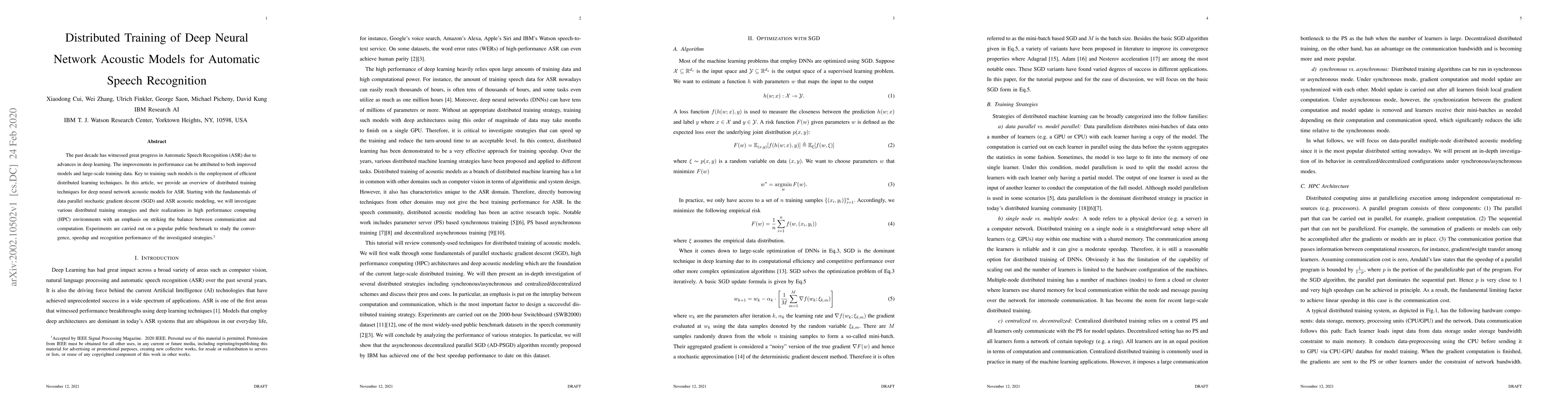 This paper reviews distributed training techniques for deep neural network acoustic models in Automatic Speech Recognition, focusing on balancing communication and computation in high-performance computing environments. Experiments on a public benchmark assess convergence, speedup, and recognition performance.