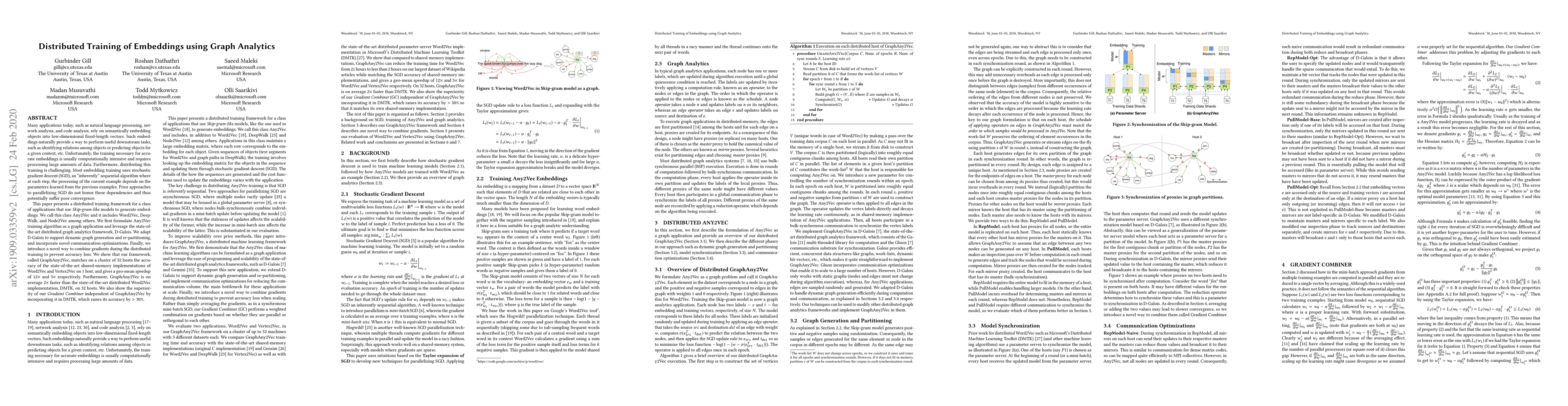Many applications today, such as NLP, network analysis, and code analysis, rely on semantically embedding objects into low-dimensional fixed-length vectors. Such embeddings naturally provide a way to perform useful downstream tasks, such as identifying relations among objects or predicting objects for a given context, etc. Unfortunately, the training necessary for accurate embeddings is usually computationally intensive and requires processing large amounts of data. Furthermore, distributing this training is challenging. Most embedding training uses stochastic gradient descent (SGD), an "inherently" sequential algorithm. Prior approaches to parallelizing SGD do not honor these dependencies and thus potentially suffer poor convergence. This paper presents a distributed training framework for a class of applications that use Skip-gram-like models to generate embeddings. We call this class Any2Vec and it includes Word2Vec, DeepWalk, and Node2Vec among others. We first formulate Any2Vec training algorithm as a graph application and leverage the state-of-the-art distributed graph analytics framework, D-Galois. We adapt D-Galois to support dynamic graph generation and repartitioning, and incorporate novel communication optimizations. Finally, we introduce a novel way to combine gradients during distributed training to prevent accuracy loss. We show that our framework, called GraphAny2Vec, matches on a cluster of 32 hosts the accuracy of the state-of-the-art shared-memory implementations of Word2Vec and Vertex2Vec on 1 host, and gives a geo-mean speedup of 12x and 5x respectively. Furthermore, GraphAny2Vec is on average 2x faster than the state-of-the-art distributed Word2Vec implementation, DMTK, on 32 hosts. We also show the superiority of our Gradient Combiner independent of GraphAny2Vec by incorporating it in DMTK, which raises its accuracy by > 30%.