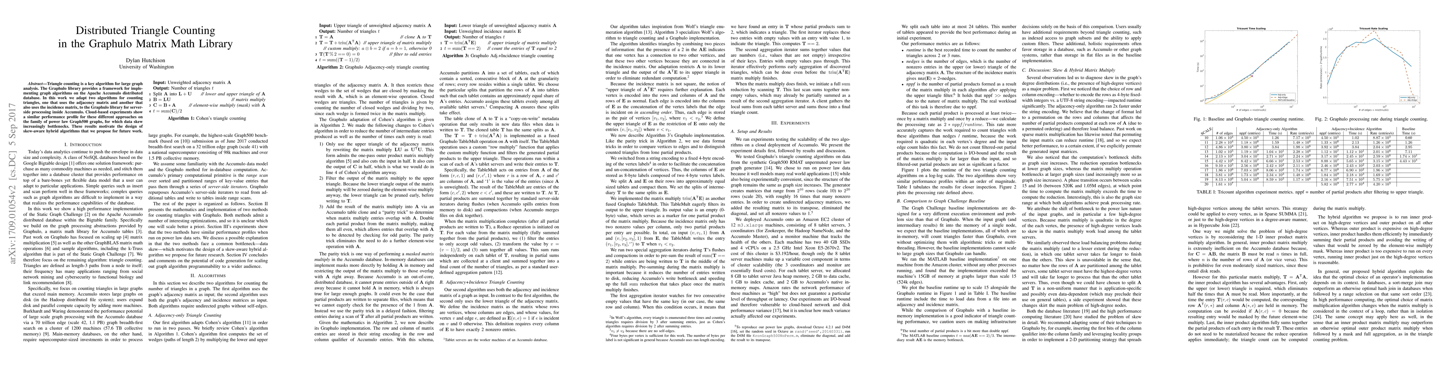 Triangle counting is a key algorithm for large graph analysis. The Graphulo library provides a framework for implementing graph algorithms on the Apache Accumulo distributed database. In this work we adapt two algorithms for counting triangles, one that uses the adjacency matrix and another that also uses the incidence matrix, to the Graphulo library for server-side processing inside Accumulo. Cloud-based experiments show a similar performance profile for these different approaches on the family of power law Graph500 graphs, for which data skew increasingly bottlenecks. These results motivate the design of skew-aware hybrid algorithms that we propose for future work.