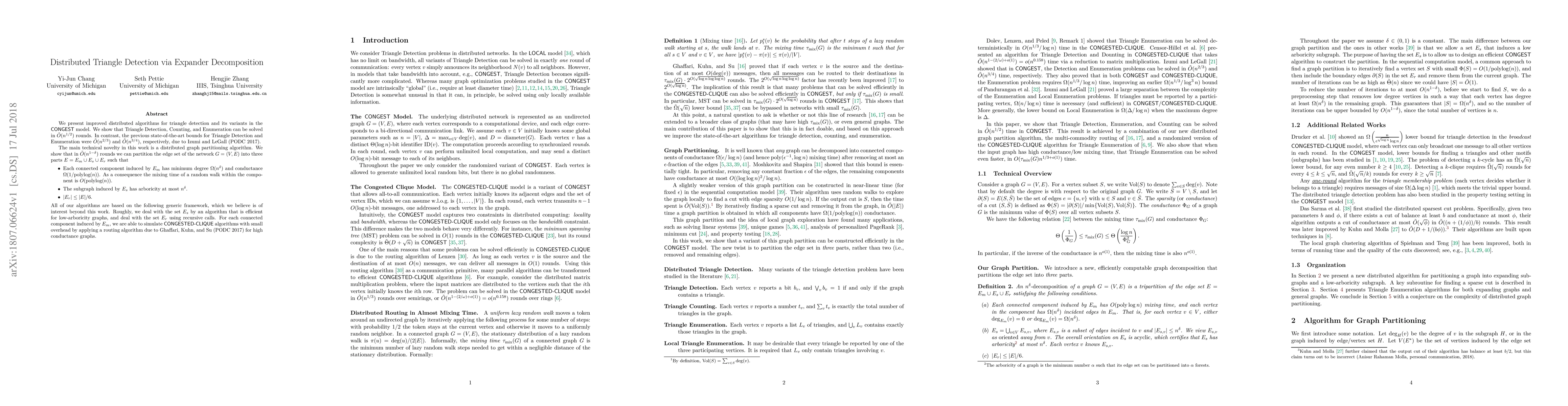 This paper presents improved distributed algorithms for triangle detection in the CONGEST model, achieving $\tilde{O}(n^{1/2})$ rounds, surpassing previous bounds. The key innovation is a distributed graph partitioning algorithm that efficiently handles different subgraph components based on their structural properties.