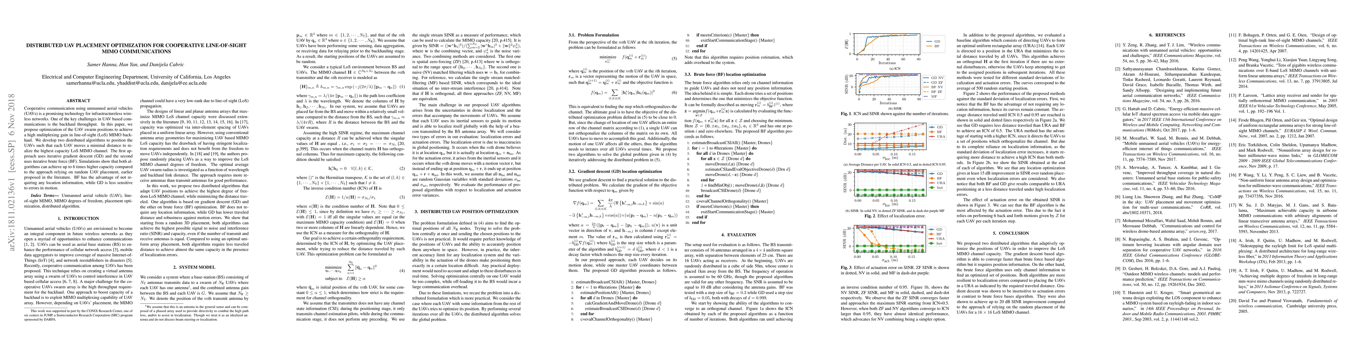 This paper proposes optimization algorithms for UAV placement to enhance cooperative line-of-sight MIMO communications, achieving up to 6 times higher capacity compared to random placement. It introduces two distributed algorithms: iterative gradient descent and brute force, with the latter requiring no location info and the former being less error-sensitive.