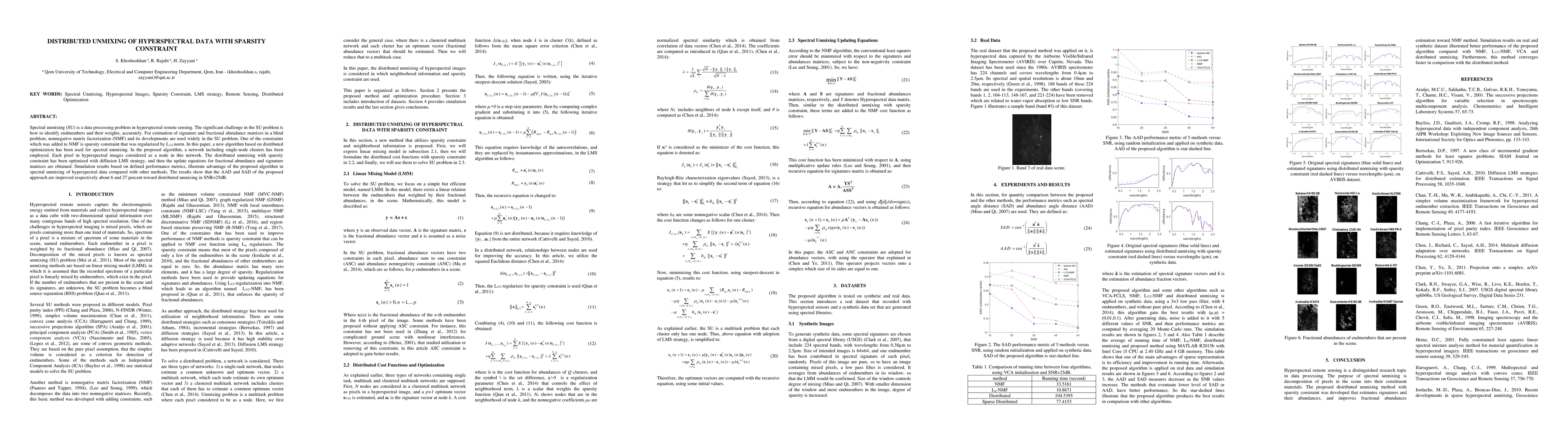 The paper presents a novel distributed optimization approach for spectral unmixing with sparsity constraint, utilizing diffusion LMS strategy for updating abundance and signature matrices.