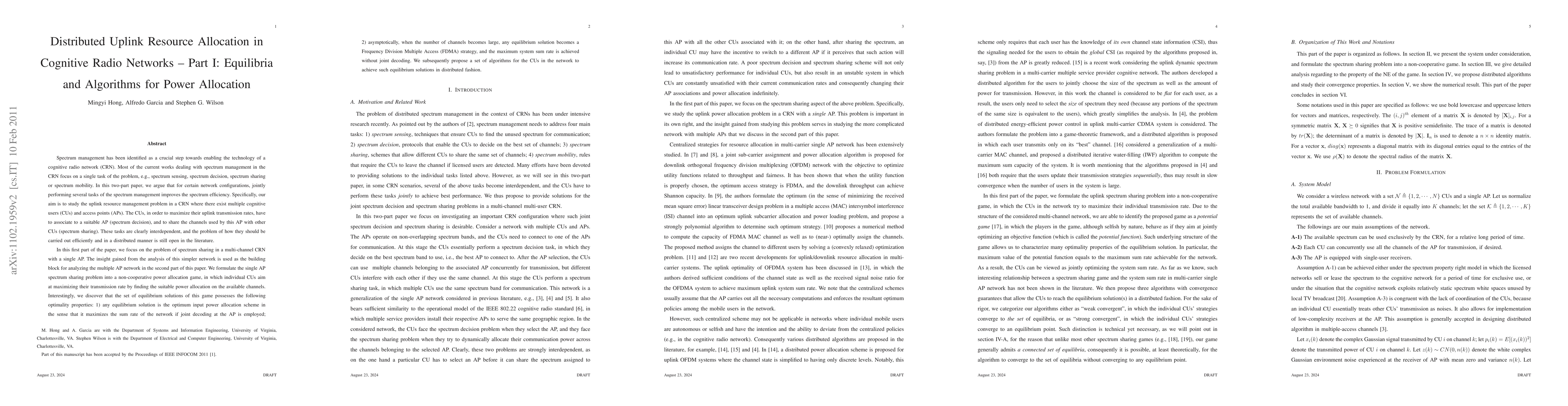 Spectrum management has been identified as a crucial step towards enabling the technology of a cognitive radio network (CRN). Most of the current works dealing with spectrum management in the CRN focus on a single task of the problem, e.g., spectrum sensing, spectrum decision, spectrum sharing or spectrum mobility. In this two-part paper, we argue that for certain network configurations, jointly performing several tasks of the spectrum management improves the spectrum efficiency. Specifically, our aim is to study the uplink resource management problem in a CRN where there exist multiple cognitive users (CUs) and access points (APs). The CUs, in order to maximize their uplink transmission rates, have to associate to a suitable AP (spectrum decision), and to share the channels used by this AP with other CUs (spectrum sharing). These tasks are clearly interdependent, and the problem of how they should be carried out efficiently and in a distributed manner is still open in the literature.