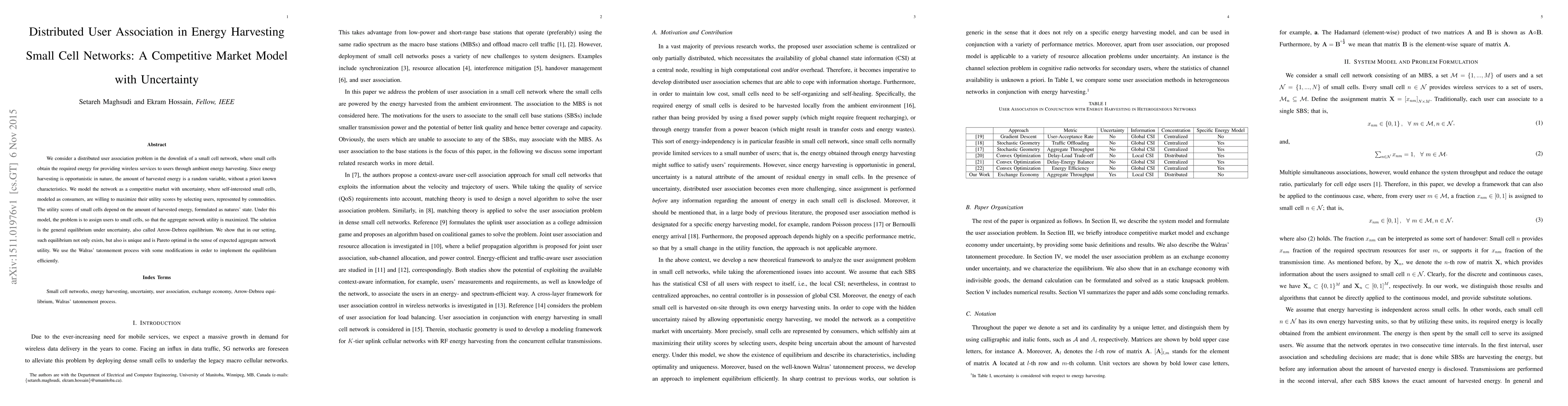 This paper addresses a distributed user association problem in energy harvesting small cell networks, modeling the network as a competitive market with uncertainty. It proposes a unique and Pareto optimal equilibrium solution under uncertainty, achieved through a modified Walras' tatonnement process.