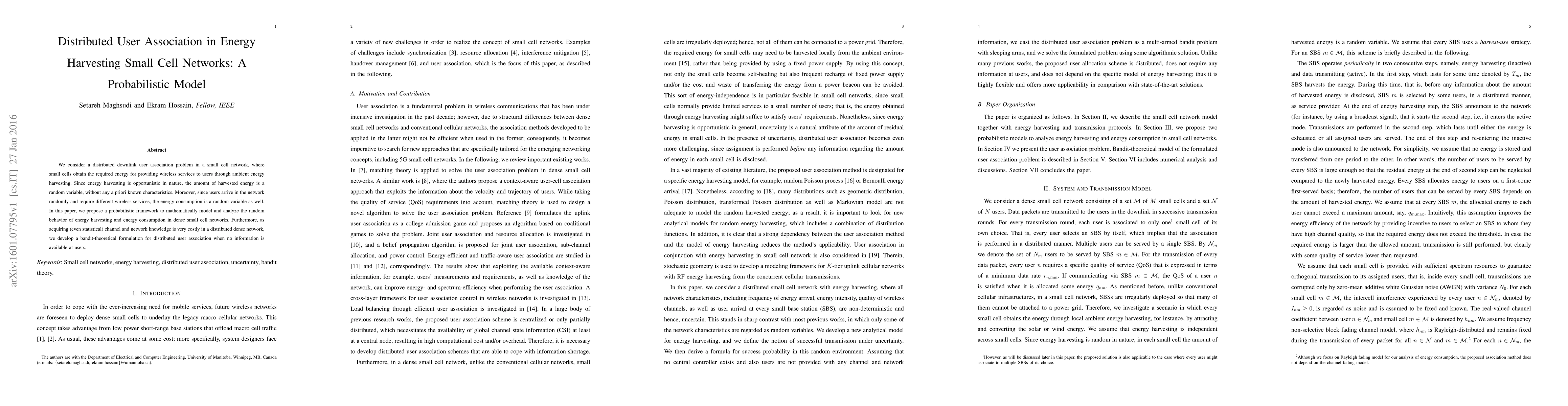 This paper proposes a probabilistic model to analyze energy harvesting and consumption in dense small cell networks, where energy availability and user demands are random. It also develops a bandit-theoretical approach for distributed user association without prior network knowledge.