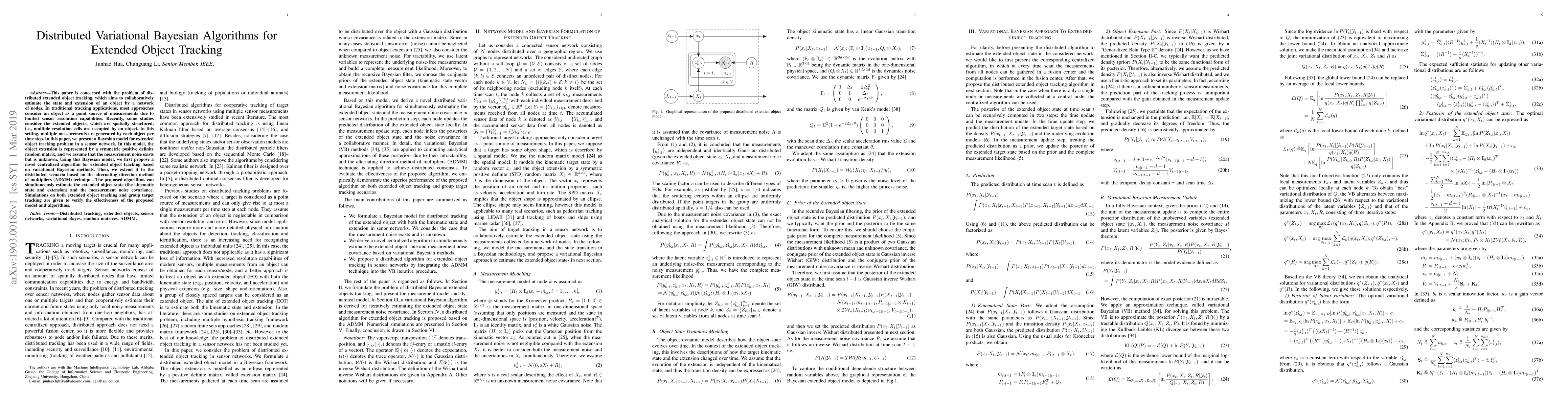 This paper is concerned with the problem of distributed extended object tracking, which aims to collaboratively estimate the state and extension of an object by a network of nodes. In traditional tracking applications, most approaches consider an object as a point source of measurements due to limited sensor resolution capabilities. Recently, some studies consider the extended objects, which are spatially structured, i.e., multiple resolution cells are occupied by an object. In this setting, multiple measurements are generated by each object per time step. In this paper, we present a Bayesian model for extended object tracking problem in a sensor network. In this model, the object extension is represented by a symmetric positive definite random matrix, and we assume that the measurement noise exists but is unknown. Using this Bayesian model, we first propose a novel centralized algorithm for extended object tracking based on variational Bayesian methods. Then, we extend it to the distributed scenario based on the alternating direction method of multipliers (ADMM) technique. The proposed algorithms can simultaneously estimate the extended object state (the kinematic state and extension) and the measurement noise covariance. Simulations on both extended object tracking and group target tracking are given to verify the effectiveness of the proposed model and algorithms.