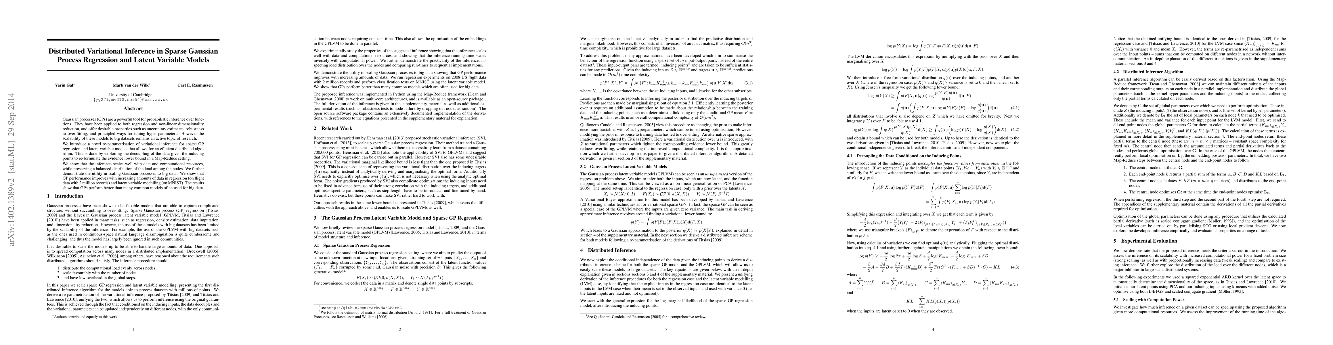 This paper introduces a novel distributed variational inference method for scalable sparse Gaussian processes in regression and latent variable models, leveraging a re-parametrisation that allows efficient parallel computation. The method scales well with data and computational resources, demonstrating improved performance on large datasets like flight records and MNIST.