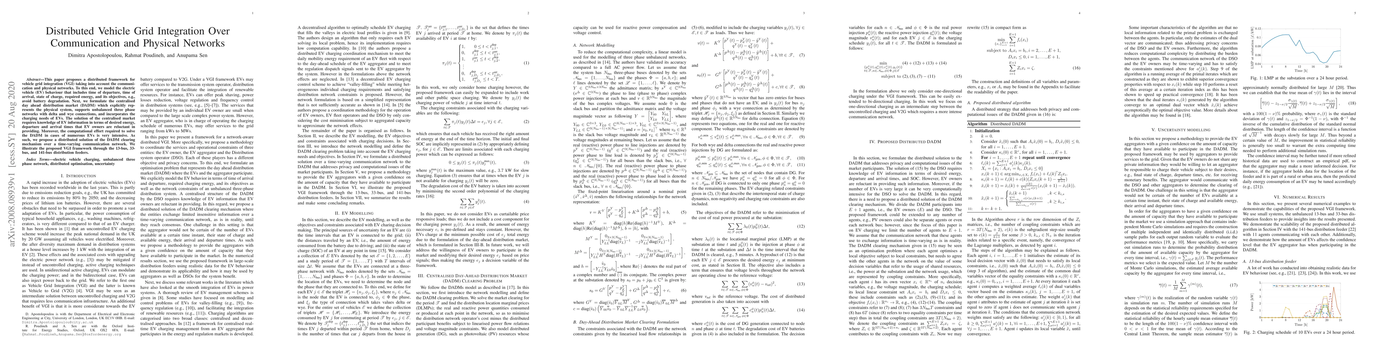 This paper proposes a distributed framework for vehicle grid integration (VGI) taking into account the communication and physical networks. To this end, we model the electric vehicle (EV) behaviour that includes time of departure, time of arrival, state of charge, required energy, and its objectives, e.g., avoid battery degradation. Next, we formulate the centralised day ahead distribution market (DADM) which explicitly represents the physical system, supports unbalanced three phase networks with delta and wye connections, and incorporates the charging needs of EVs. The solution of the centralised market requires knowledge of EV information in terms of desired energy, departure and arrival times that EV owners are reluctant in providing. Moreover, the computational effort required to solve the DADM in cases of numerous EVs is very intensive. As such, we propose a distributed solution of the DADM clearing mechanism over a time-varying communication network. We illustrate the proposed VGI framework through the 13-bus, 33- bus, and 141-bus distribution feeders.