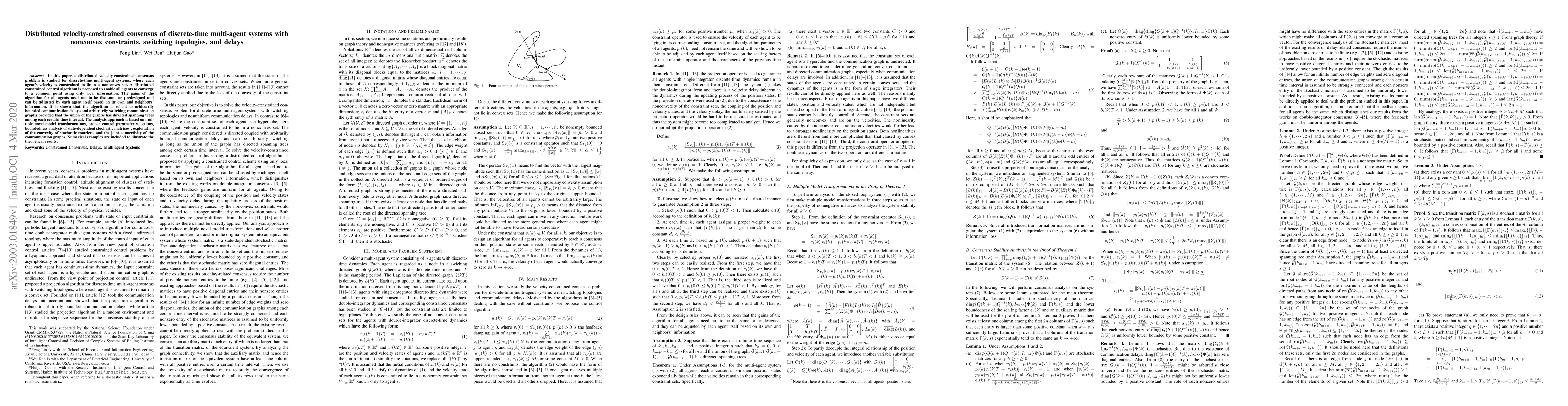 In this paper, a distributed velocity-constrained consensus problem is studied for discrete-time multi-agent systems, where each agent's velocity is constrained to lie in a nonconvex set. A distributed constrained control algorithm is proposed to enable all agents to converge to a common point using only local information. {The gains of the algorithm for all agents need not to be the same or predesigned and can be adjusted by each agent itself based on its own and neighbors' information.} It is shown that the algorithm is robust to arbitrarily bounded communication delays and arbitrarily switching communication graphs provided that the union of the graphs has directed spanning trees among each certain time interval. The analysis approach is based on multiple novel model transformations, proper control parameter selections, boundedness analysis of state-dependent stochastic matrices, exploitation of the convexity of stochastic matrices, and the joint connectivity of the communication graphs. Numerical examples are included to illustrate the theoretical results.