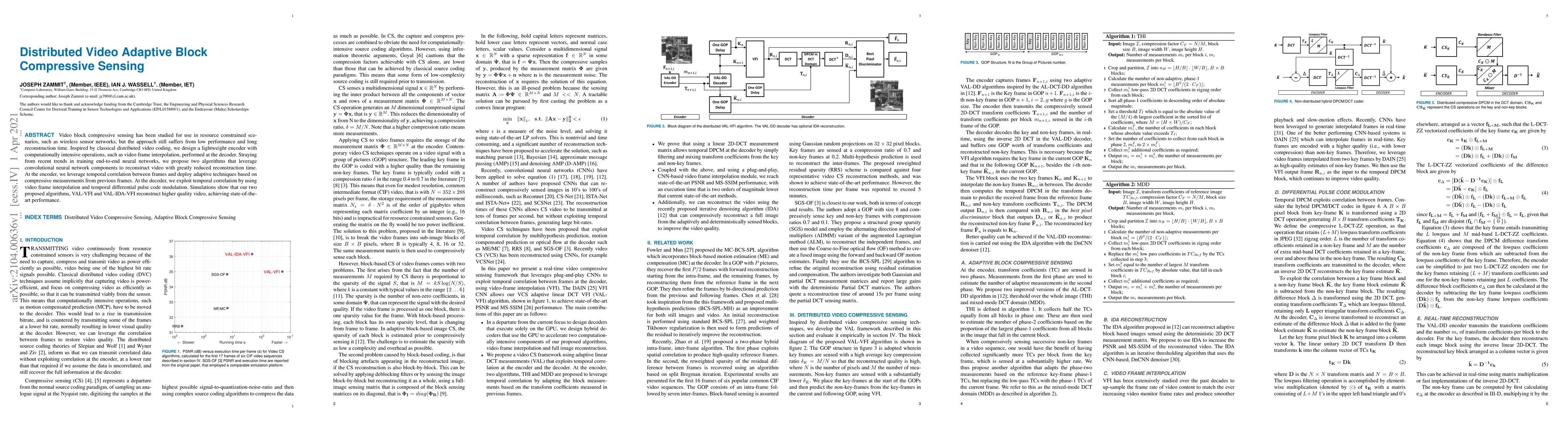 Video block compressive sensing has been studied for use in resource constrained scenarios, such as wireless sensor networks, but the approach still suffers from low performance and long reconstruction time. Inspired by classical distributed video coding, we design a lightweight encoder with computationally intensive operations, such as video frame interpolation, performed at the decoder. Straying from recent trends in training end-to-end neural networks, we propose two algorithms that leverage convolutional neural network components to reconstruct video with greatly reduced reconstruction time. At the encoder, we leverage temporal correlation between frames and deploy adaptive techniques based on compressive measurements from previous frames. At the decoder, we exploit temporal correlation by using video frame interpolation and temporal differential pulse code modulation. Simulations show that our two proposed algorithms, VAL-VFI and VAL-IDA-VFI reconstruct higher quality video, achieving state-of-the-art performance.