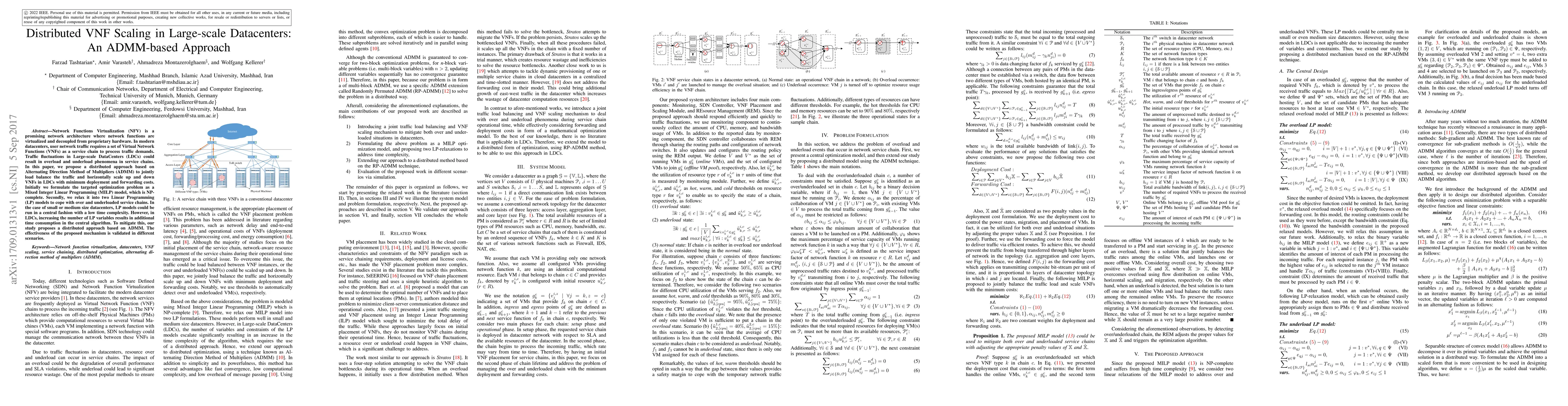 This paper proposes a distributed ADMM-based approach to jointly load balance and scale Virtual Network Functions (VNFs) in large-scale datacenters, addressing traffic fluctuations and minimizing deployment and forwarding costs. The method transforms the NP-complete Mixed Integer Linear Programming (MILP) problem into Linear Programming (LP) models, which are efficiently managed in smaller datacenters but scaled using ADMM for larger environments.