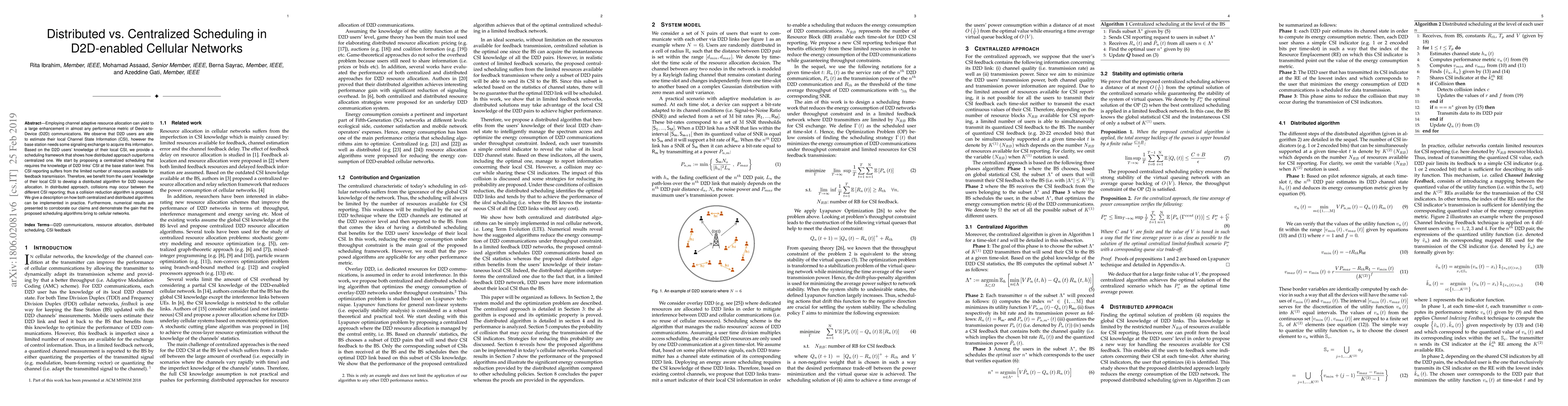 Employing channel adaptive resource allocation can yield to a large enhancement in almost any performance metric of Device-to-Device (D2D) communications. We observe that D2D users are able to estimate their local Channel State Information (CSI), however the base station needs some signaling exchange to acquire this information. Based on the D2D users' knowledge of their local CSI, we provide a scheduling framework that shows how distributed approach outperforms centralized one. We start by proposing a centralized scheduling that requires the knowledge of D2D links' CSI at the base station level. This CSI reporting suffers from the limited number of resources available for feedback transmission. Therefore, we benefit from the users' knowledge of their local CSI to develop a distributed algorithm for D2D resource allocation. In distributed approach, collisions may occur between the different CSI reporting; thus a collision reduction algorithm is proposed. We give a description on how both centralized and distributed algorithms can be implemented in practice. Furthermore, numerical results are presented to corroborate our claims and demonstrate the gain that the proposed scheduling algorithms bring to cellular networks.