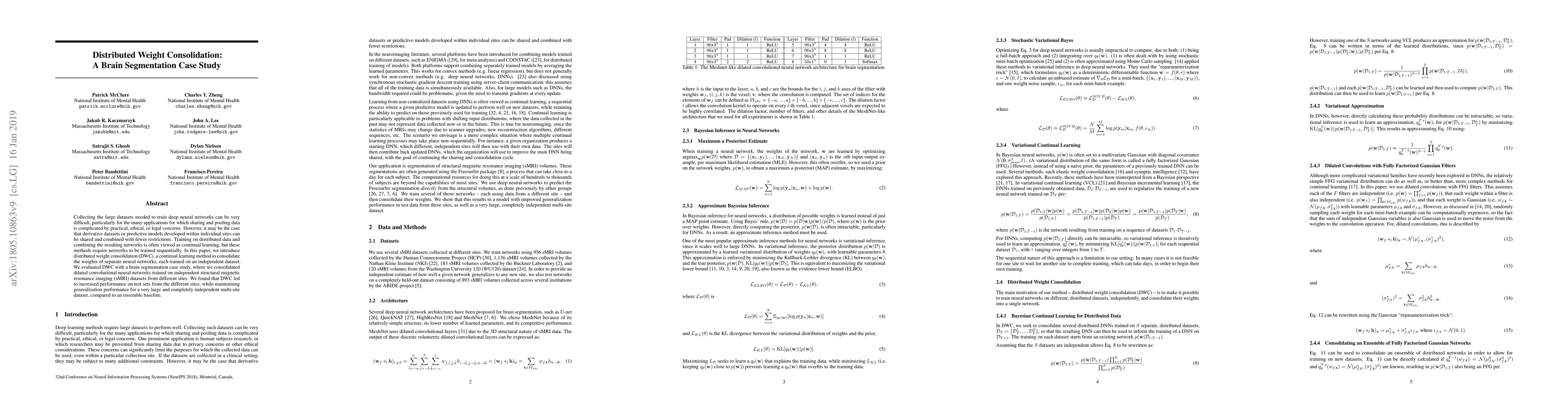 Researchers introduced a method called Distributed Weight Consolidation (DWC) to combine neural networks trained on independent datasets without sequential training, improving performance on test sets from different sites. DWC outperformed an ensemble baseline in a brain segmentation case study using structural MRI datasets from multiple sites.