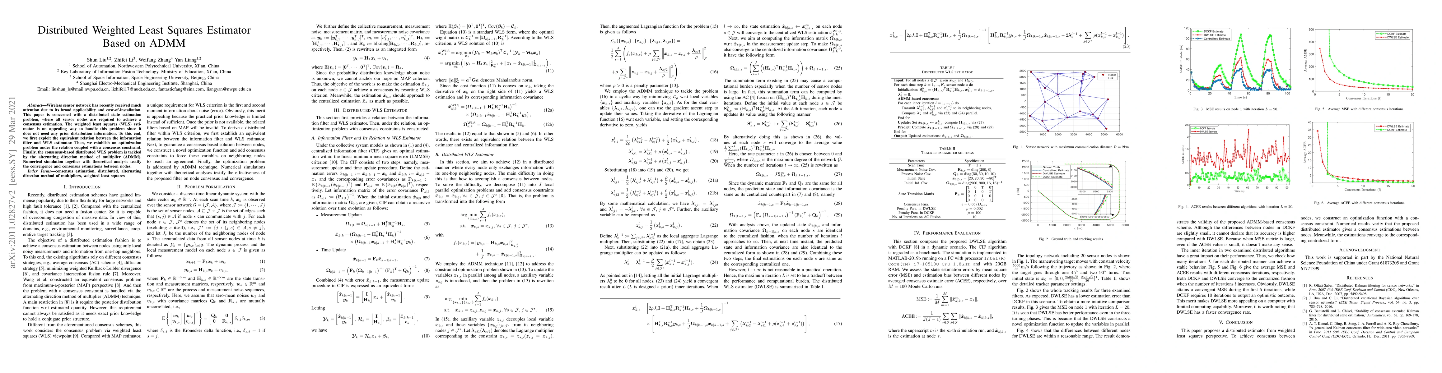 This paper proposes a distributed weighted least squares (WLS) estimator for wireless sensor networks using the alternating direction method of multipliers (ADMM). It leverages the equivalence between information filter and WLS to solve a consensus-based optimization problem, achieving agreement among sensor nodes without requiring prior distribution information.