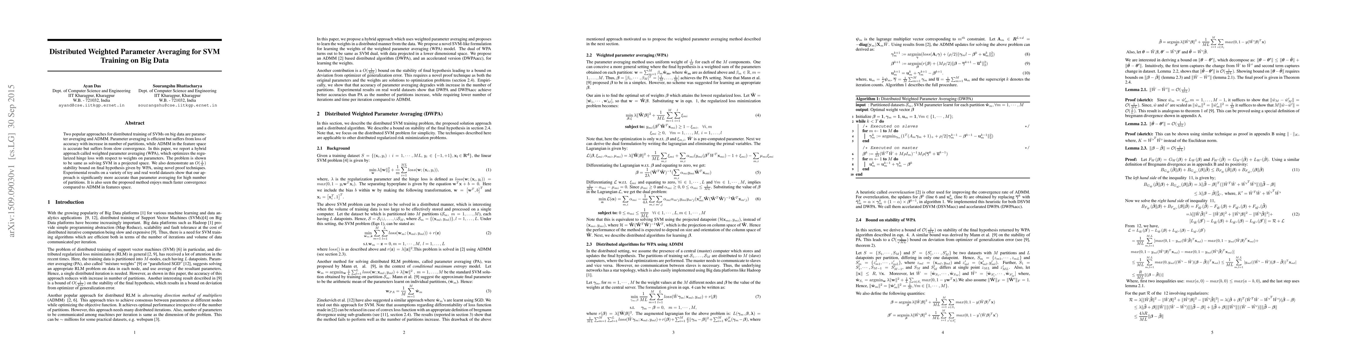 This paper proposes a hybrid weighted parameter averaging (WPA) approach for distributed SVM training on big data, combining the efficiency of parameter averaging with the accuracy of ADMM. The method achieves faster convergence and better accuracy compared to traditional methods.
