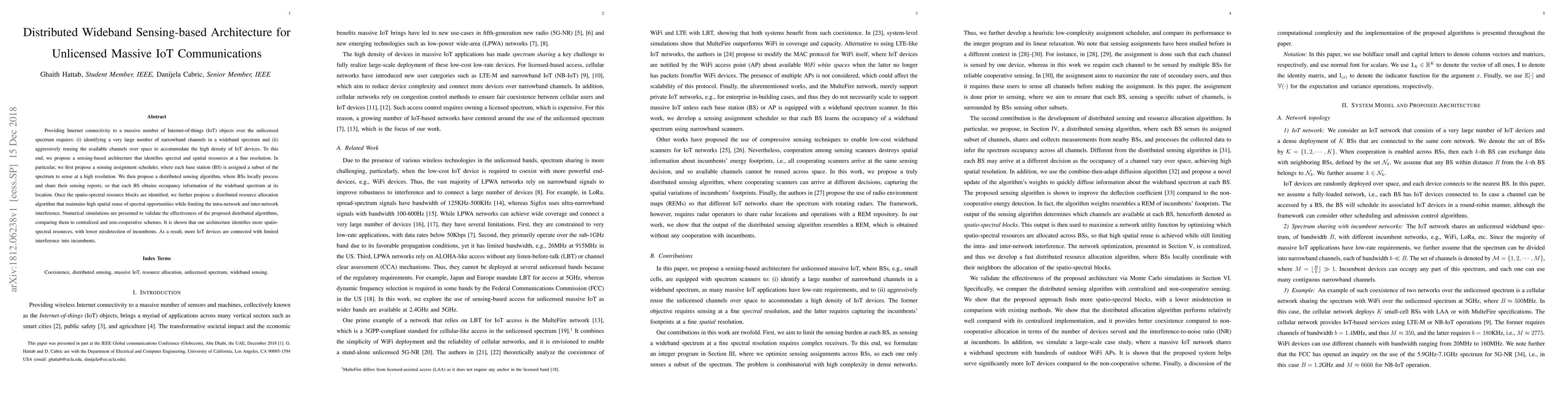 This paper proposes a distributed wideband sensing architecture for massive IoT communications over unlicensed spectrum, focusing on identifying numerous narrowband channels and reusing them efficiently. The architecture includes a sensing scheduler, distributed sensing algorithm, and resource allocation method to optimize spatial reuse and minimize interference, validated by simulations showing improved resource identification and connectivity for IoT devices.