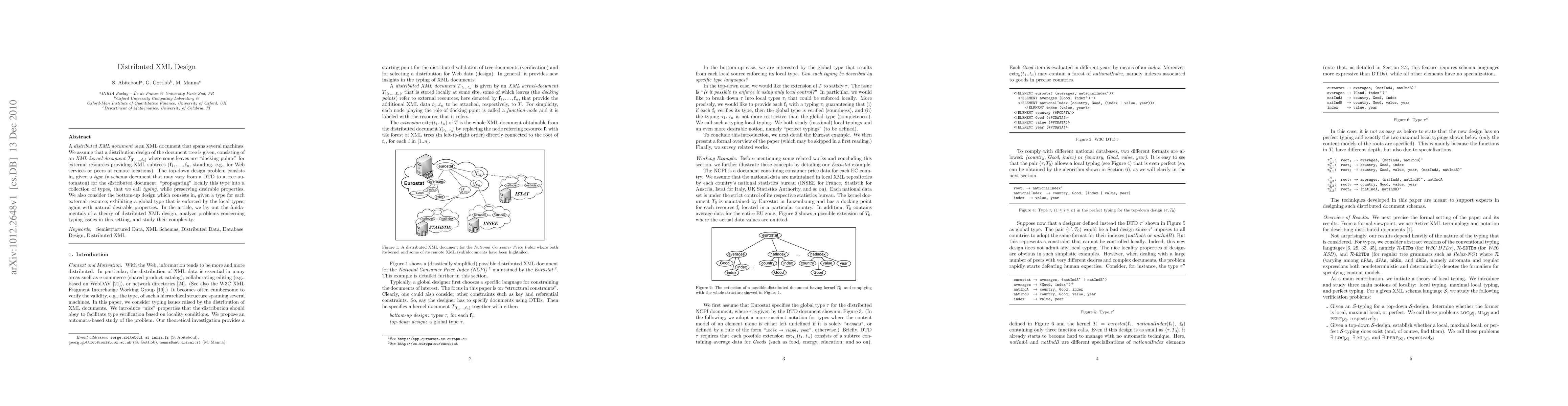 This paper explores the design of distributed XML documents that span multiple machines, focusing on the propagation of XML schemas to maintain consistency across distributed docking points. It examines both top-down and bottom-up design approaches, analyzing the complexities and desirable properties of typing in distributed XML environments.