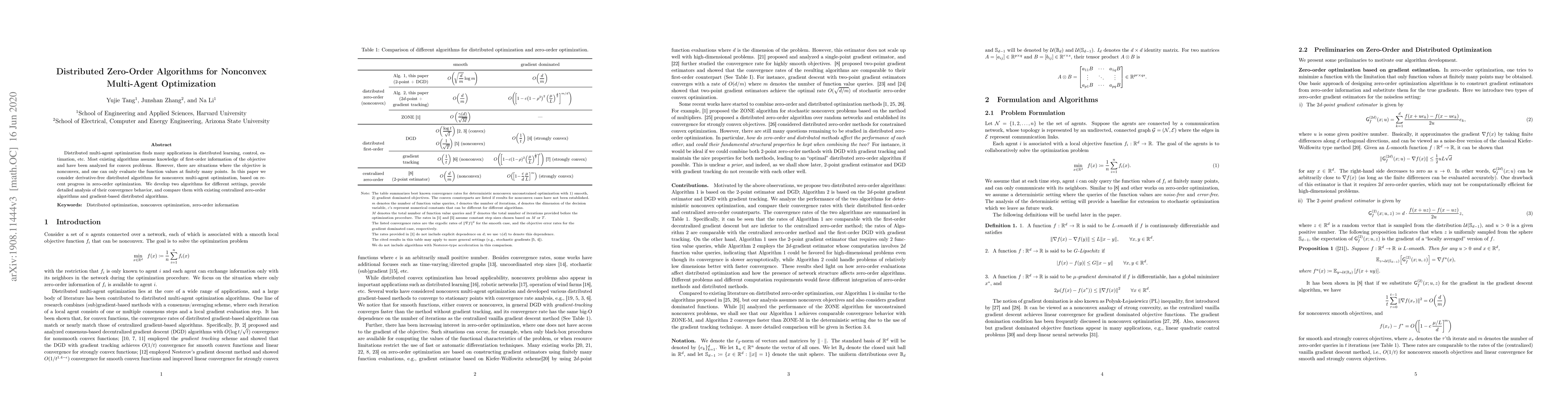 This paper proposes derivative-free distributed algorithms for nonconvex multi-agent optimization, addressing scenarios where only function values can be evaluated. It develops two algorithms, analyzes their convergence, and compares them with existing centralized and gradient-based distributed methods.