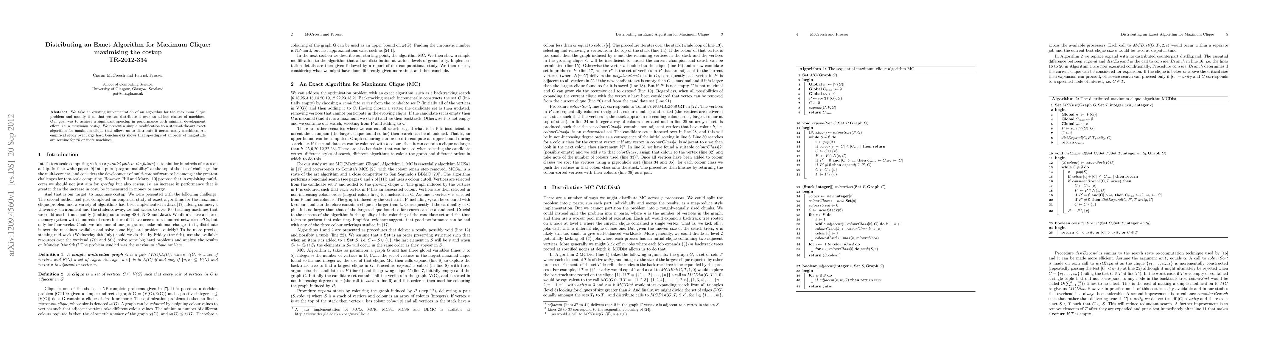 We take an existing implementation of an algorithm for the maximum clique problem and modify it so that we can distribute it over an ad-hoc cluster of machines. Our goal was to achieve a significant speedup in performance with minimal development effort, i.e. a maximum costup. We present a simple modification to a state-of-the-art exact algorithm for maximum clique that allows us to distribute it across many machines. An empirical study over large hard benchmarks shows that speedups of an order of magnitude are routine for 25 or more machines.