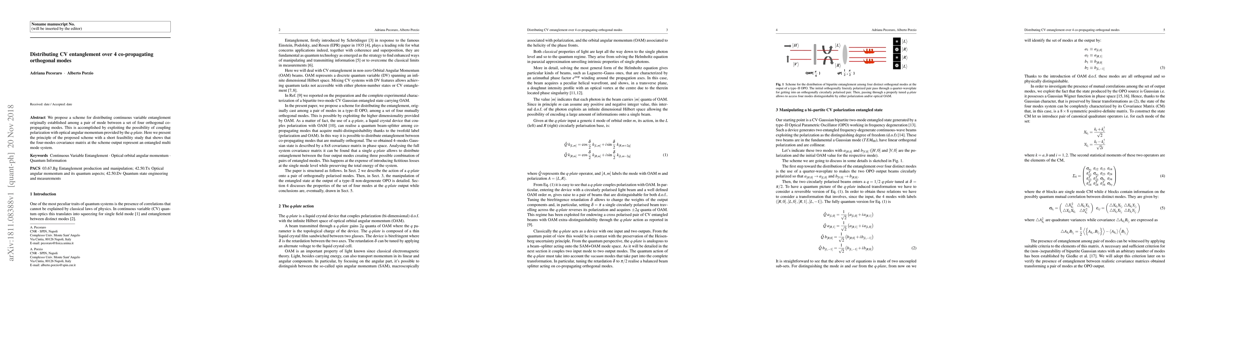 We propose a scheme for distributing continuous variable entanglement originally established among a pair of mode between a set of four orthogonal co-propagating modes. This is accomplished by exploiting the possibility of coupling polarization with optical angular momentum provided by the q-plate. Here we present the principle of the proposed scheme with a short feasibility study that shows that the four-modes covariance matrix at the scheme output represent an entangled multi mode system.