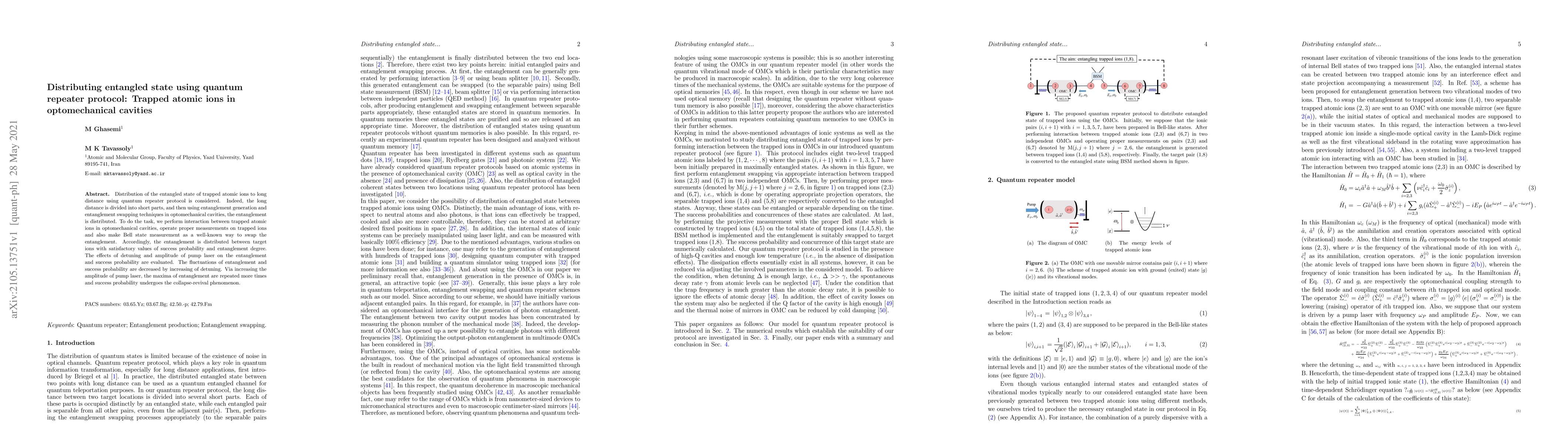 This paper explores the distribution of entangled states of trapped atomic ions over long distances using a quantum repeater protocol within optomechanical cavities. The study successfully demonstrates entanglement distribution through entanglement generation and swapping techniques, evaluating the impact of detuning and pump laser amplitude on entanglement and success probability.