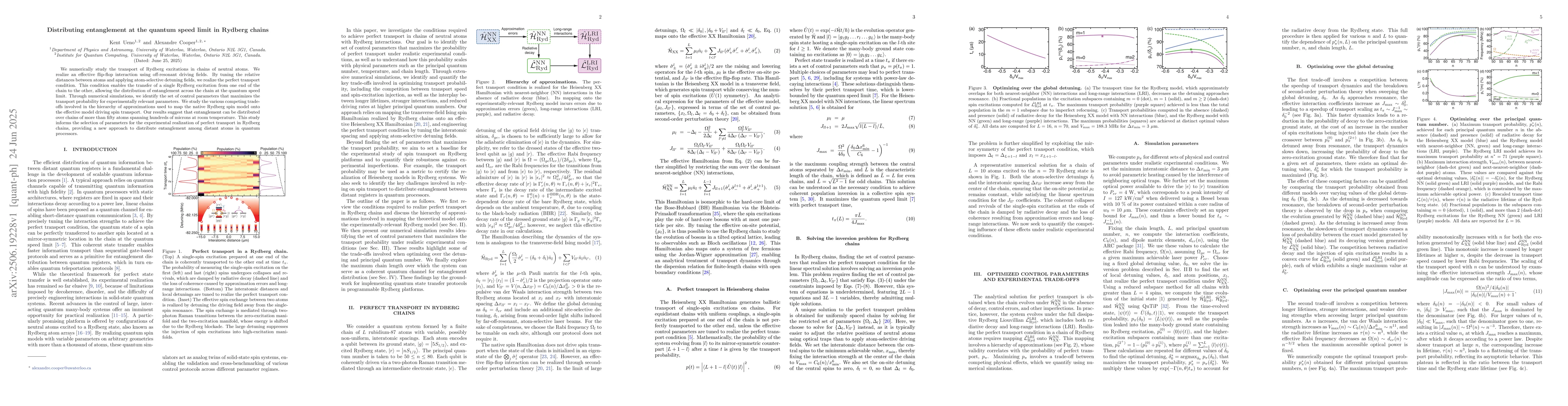 We numerically study the transport of Rydberg excitations in chains of neutral atoms. We realize an effective flip-flop interaction using off-resonant driving fields. By tuning the relative distances between atoms and applying atom-selective detuning fields, we realize the perfect transport condition. This condition enables the transfer of a single Rydberg excitation from one end of the chain to the other, allowing the distribution of entanglement across the chain at the quantum speed limit. Through numerical simulations, we identify the set of control parameters that maximize the transport probability for experimentally relevant parameters. We study the various competing trade-offs involved in the hierarchy of approximations used to map the native Rydberg spin model onto the effective model driving spin transport. Our results suggest that entanglement can be distributed over chains of more than fifty atoms spanning hundreds of microns at room temperature. This study informs the selection of parameters for the experimental realization of perfect transport in Rydberg chains, providing a new approach to distribute entanglement among distant atoms in quantum processors.