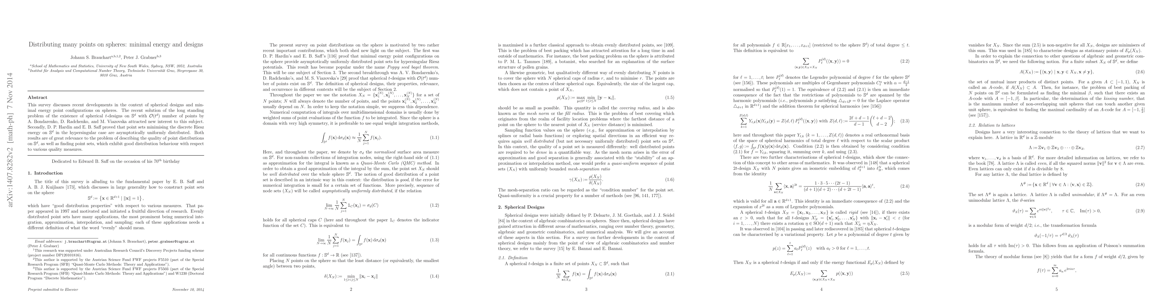 Recent research has made progress in designing spherical point sets with minimal energy, including the existence of spherical t-designs on spheres and asymptotically uniformly distributed points.