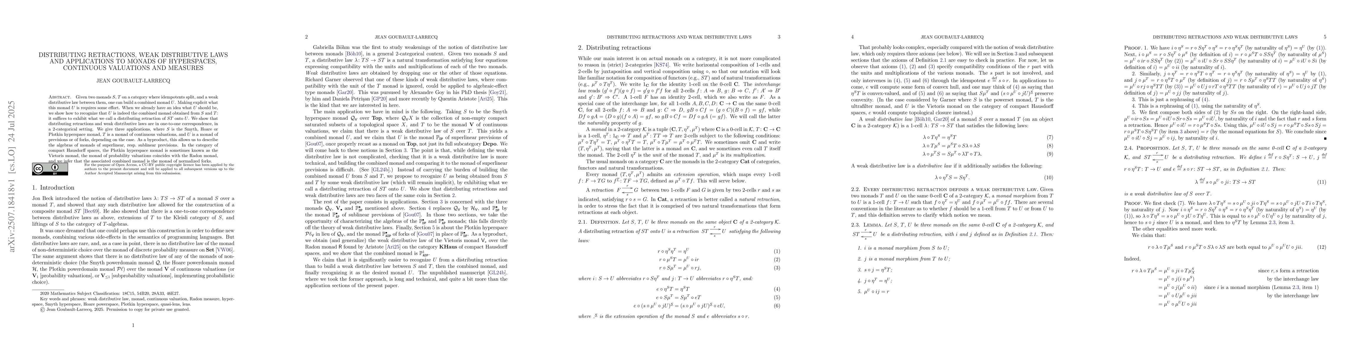 Given two monads $S$, $T$ on a category where idempotents split, and a weak distributive law between them, one can build a combined monad $U$. Making explicit what this monad $U$ is requires some effort. When we already have an idea what $U$ should be, we show how to recognize that $U$ is indeed the combined monad obtained from $S$ and $T$: it suffices to exhibit what we call a distributing retraction of $ST$ onto $U$. We show that distributing retractions and weak distributive laws are in one-to-one correspondence, in a 2-categorical setting. We give three applications, where $S$ is the Smyth, Hoare or Plotkin hyperspace monad, $T$ is a monad of continuous valuations, and $U$ is a monad of previsions or of forks, depending on the case. As a byproduct, this allows us to describe the algebras of monads of superlinear, resp. sublinear previsions. In the category of compact Hausdorff spaces, the Plotkin hyperspace monad is sometimes known as the Vietoris monad, the monad of probability valuations coincides with the Radon monad, and we infer that the associated combined monad is the monad of normalized forks.