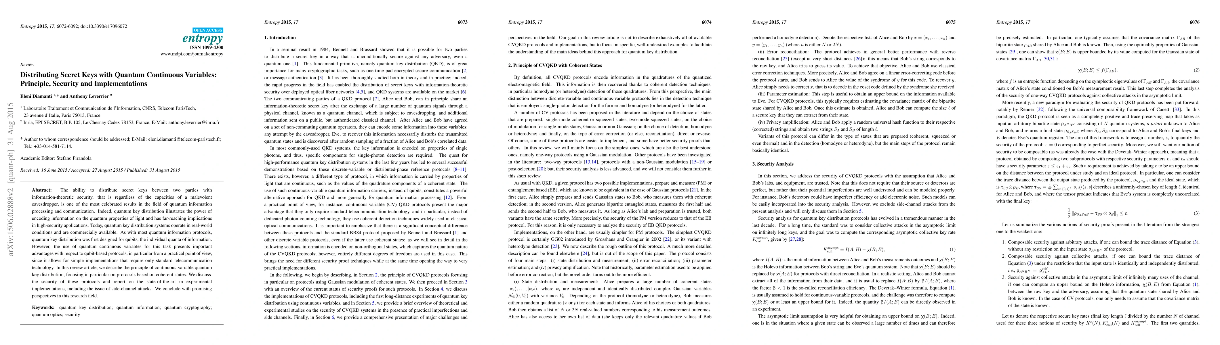 This paper reviews the principle, security, and implementations of distributing secret keys using quantum continuous variables, focusing on coherent state protocols. It highlights advantages over qubit-based methods, including simpler implementations with standard telecom technology, and discusses experimental progress and side-channel attack issues in this field.