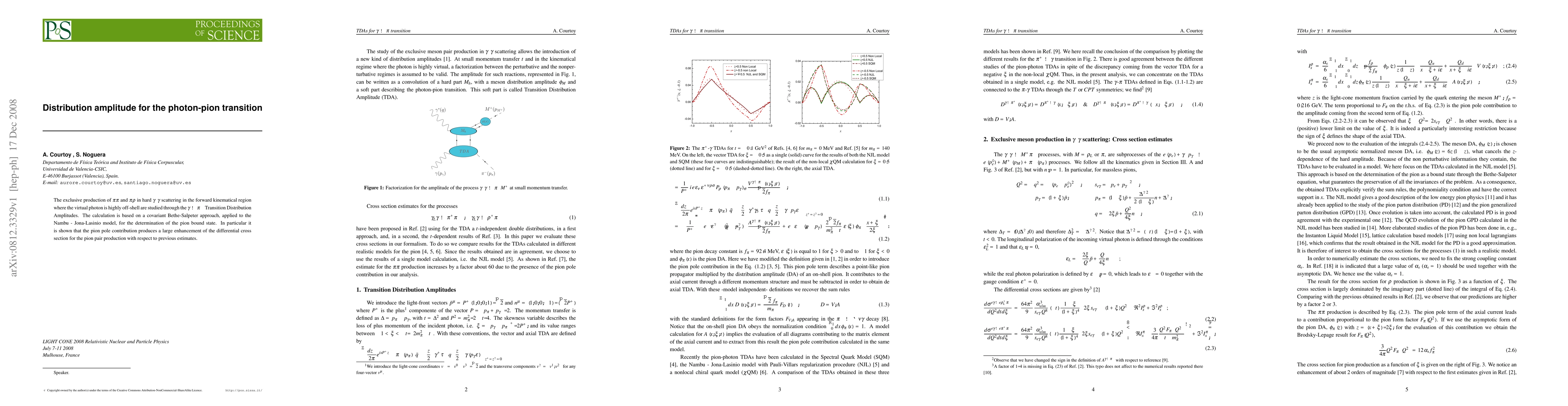 The exclusive production of \pi\pi and \pi\rho in hard \gamma^{\star}\gamma scattering in the forward kinematical region where the virtual photon is highly off-shell are studied through the \gamma\to\pi^- Transition Distribution Amplitudes. The calculation is based on a covariant Bethe-Salpeter approach, applied to the Nambu - Jona-Lasinio model, for the determination of the pion bound state. In particular it is shown that the pion pole contribution produces a large enhancement of the differential cross section for the pion pair production with respect to previous estimates.