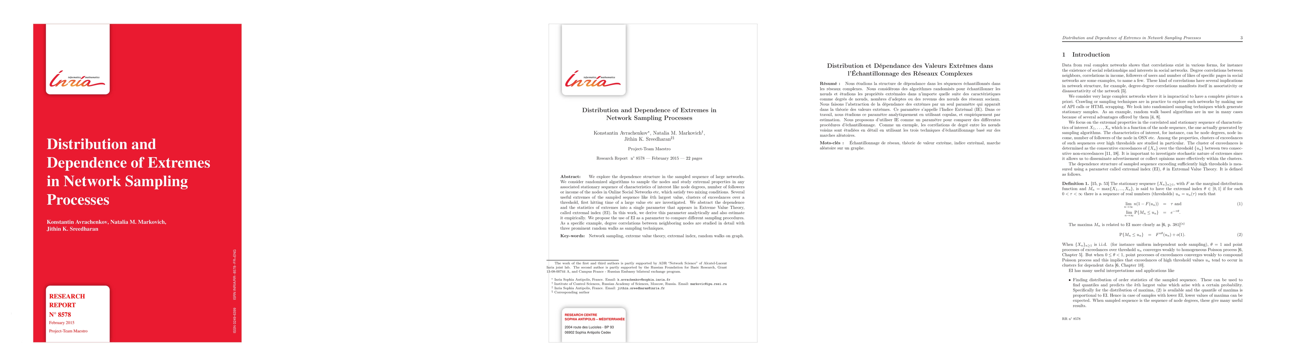 We explore the dependence structure in the sampled sequence of large networks. We consider randomized algorithms to sample the nodes and study extremal properties in any associated stationary sequence of characteristics of interest like node degrees, number of followers or income of the nodes in Online Social Networks etc, which satisfy two mixing conditions. Several useful extremes of the sampled sequence like $k$th largest value, clusters of exceedances over a threshold, first hitting time of a large value etc are investigated. We abstract the dependence and the statistics of extremes into a single parameter that appears in Extreme Value Theory, called extremal index (EI). In this work, we derive this parameter analytically and also estimate it empirically. We propose the use of EI as a parameter to compare different sampling procedures. As a specific example, degree correlations between neighboring nodes are studied in detail with three prominent random walks as sampling techniques.